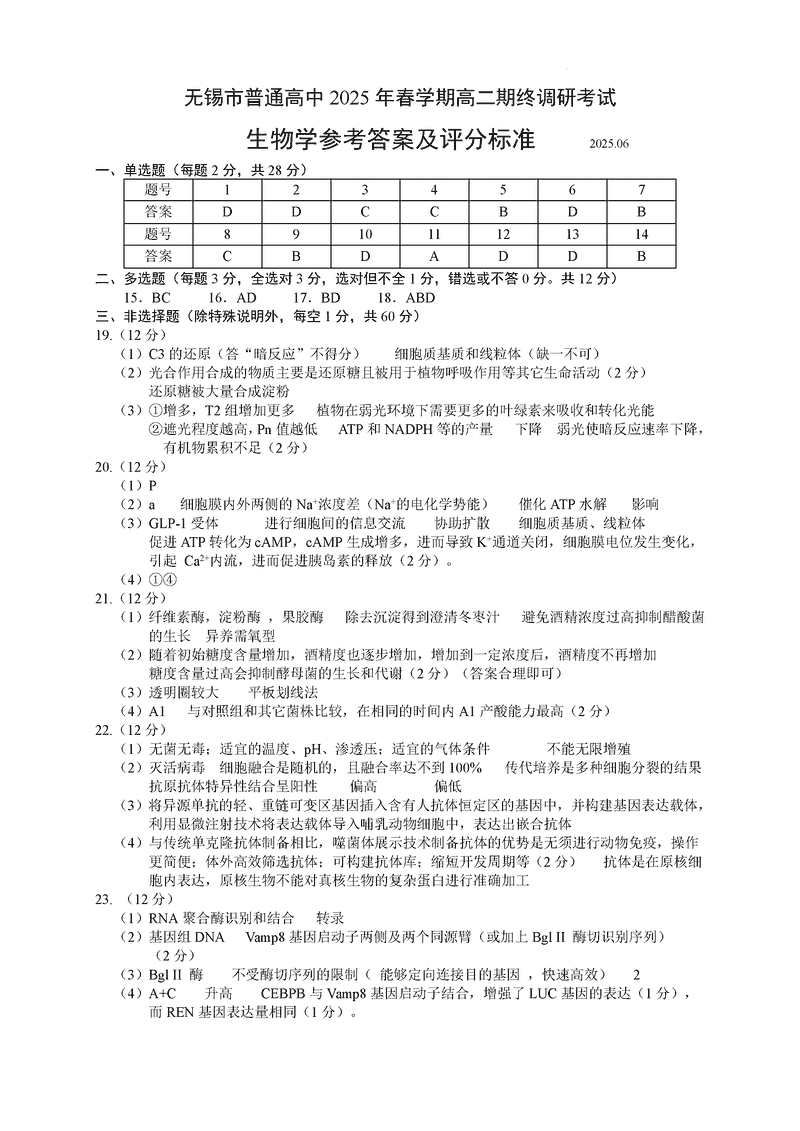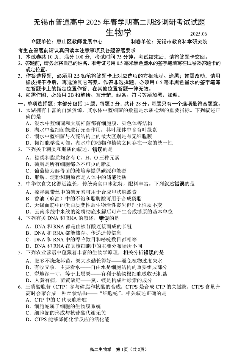 无锡市普通高中2025年春学期高二期终调研生物试题及答案 时间:2025-07-08 江苏 高中生物 江苏省无锡市普通高中2025年春学期高二期终调研生物考试已于近日开考,为方便考生考后及时查看考试情况,查漏补缺、弥补不足,本文整理了试题答案解析相关信息! 生物试题及答案解析