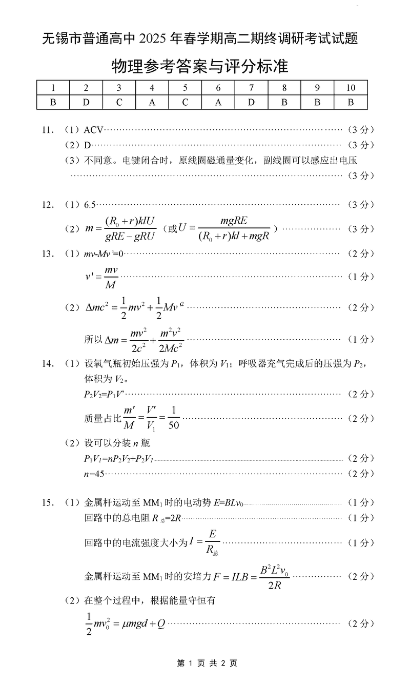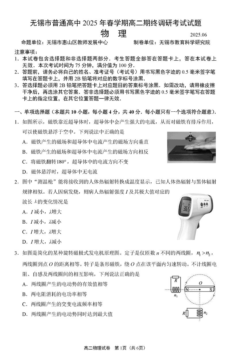 无锡市普通高中2025年春学期高二期终调研物理试题及答案 时间:2025-07-08 江苏 高中物理 江苏省无锡市普通高中2025年春学期高二期终调研物理考试已于近日开考,为方便考生考后及时查看考试情况,查漏补缺、弥补不足,本文整理了试题答案解析相关信息! 物理试题及答案解析