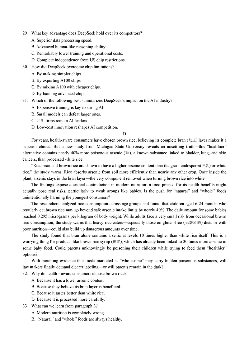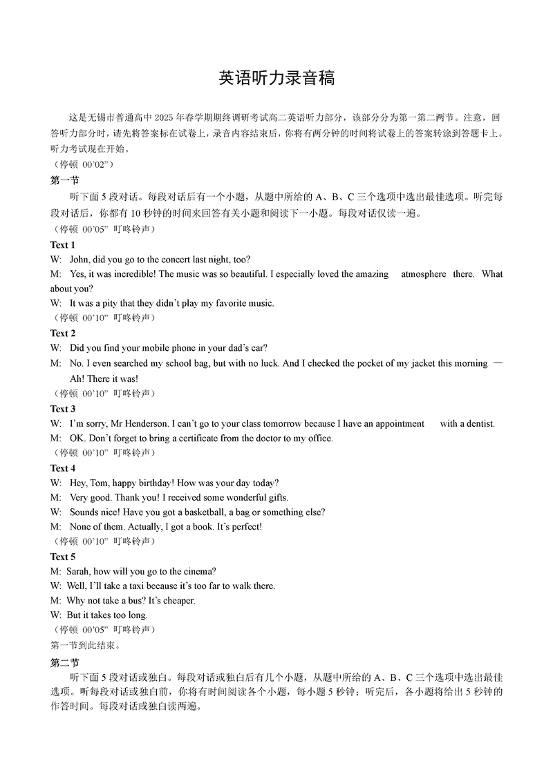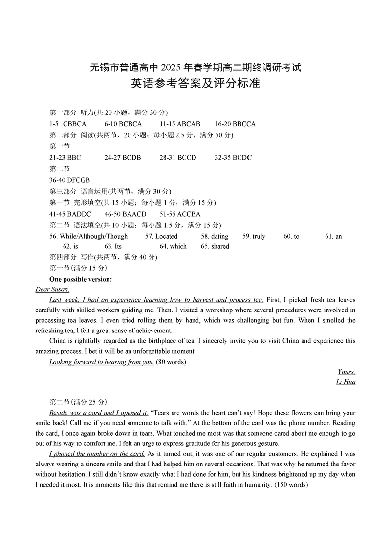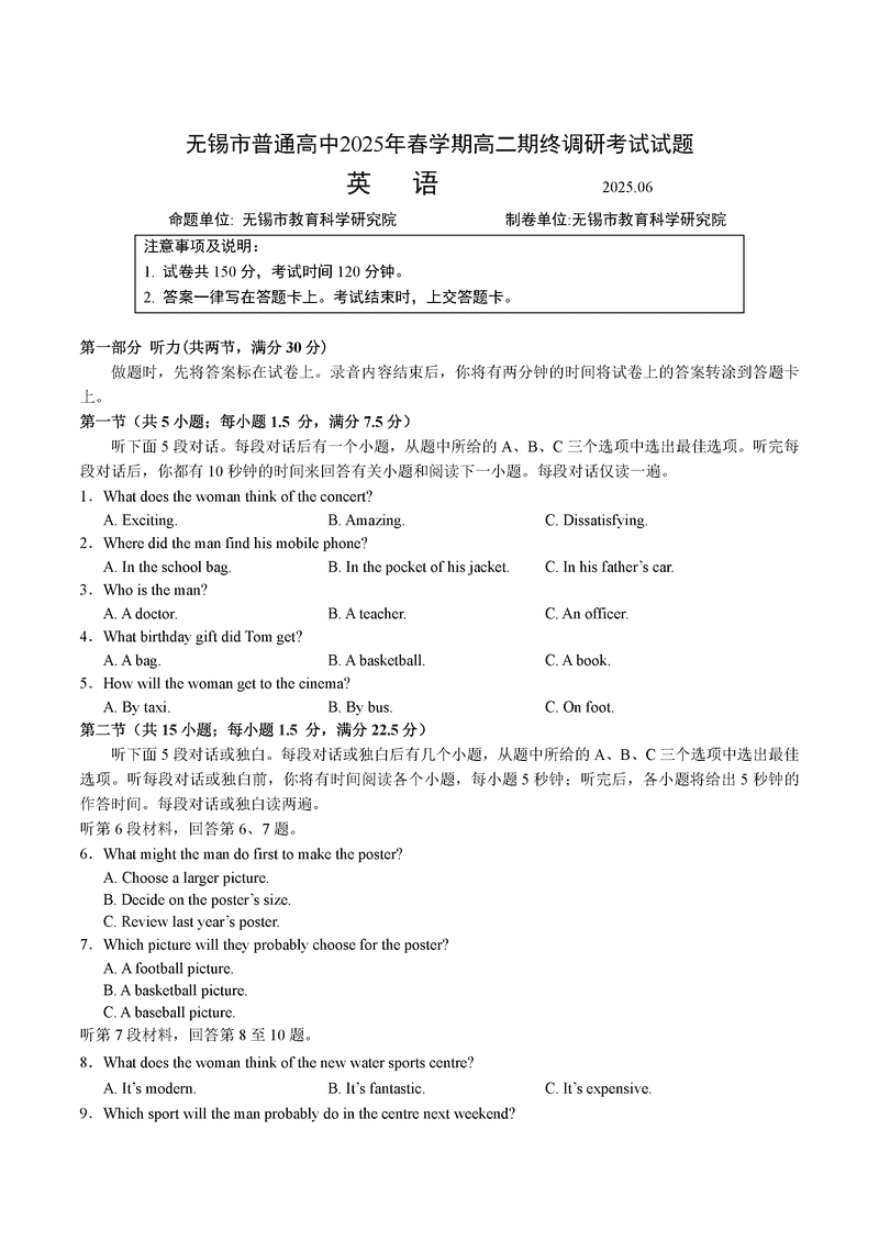无锡市普通高中2025年春学期高二期终调研英语试题及答案 时间:2025-07-08 江苏 高中英语 江苏省无锡市普通高中2025年春学期高二期终调研英语考试已于近日开考,为方便考生考后及时查看考试情况,查漏补缺、弥补不足,本文整理了试题答案解析相关信息! 英语试题及答案解析