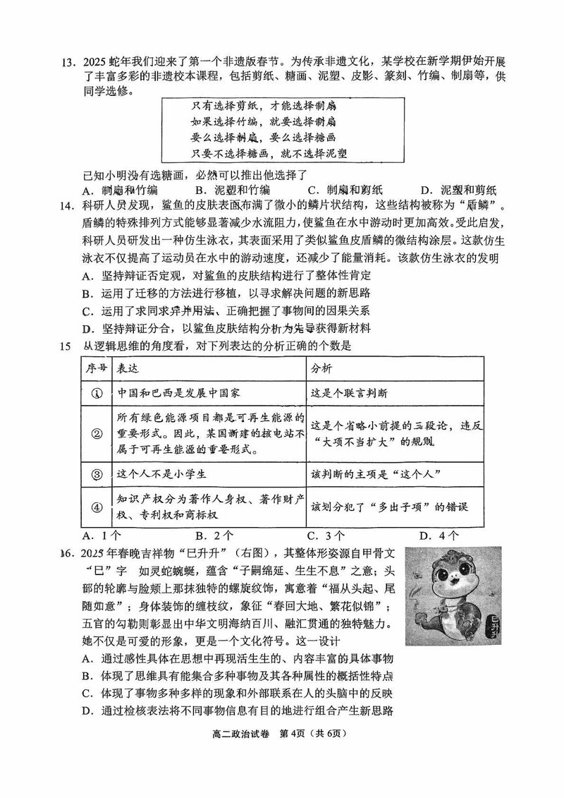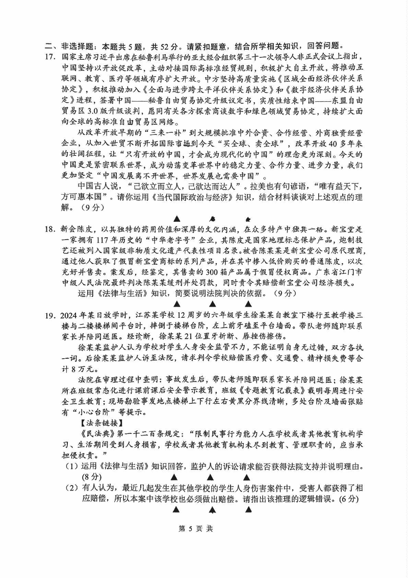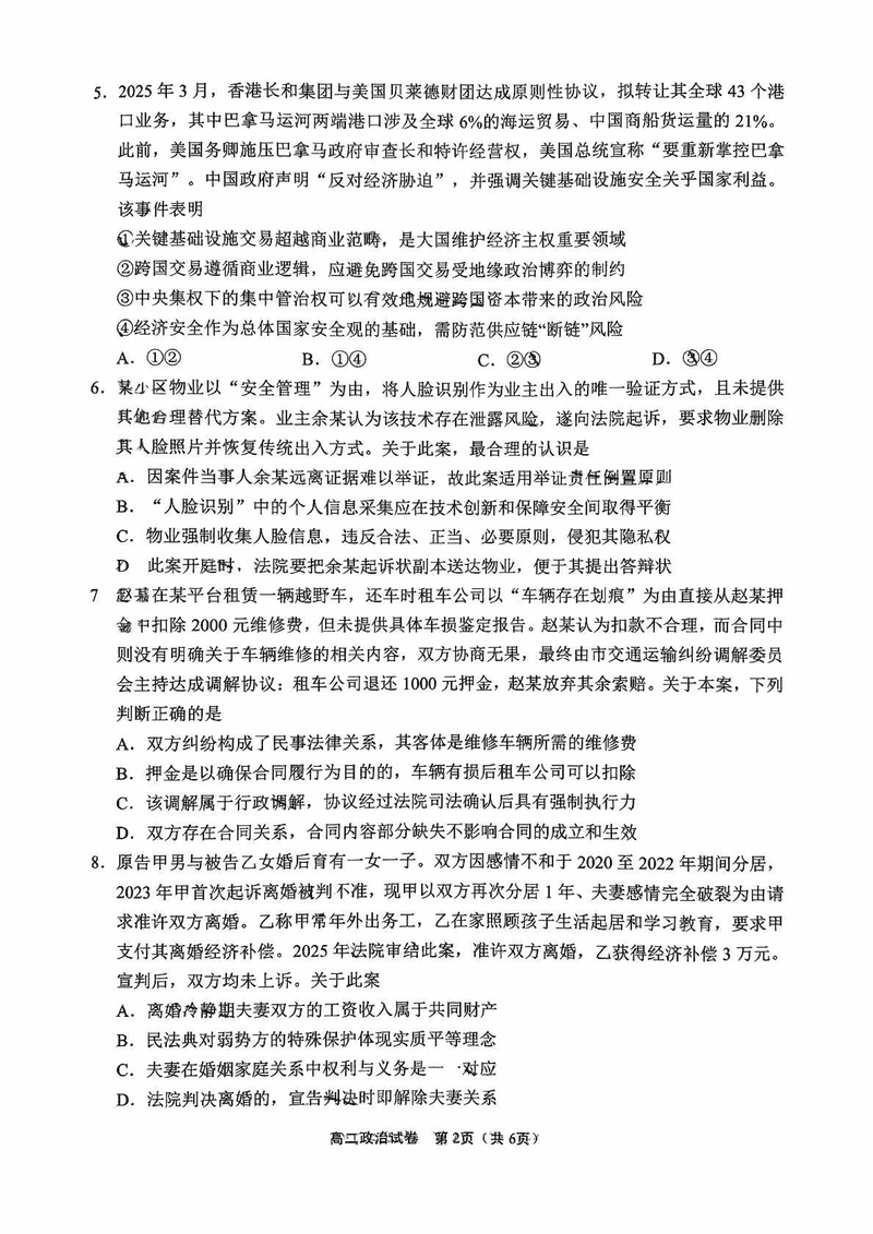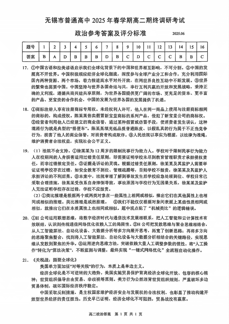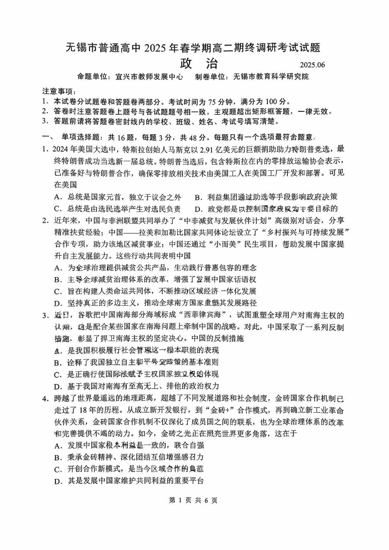 无锡市普通高中2025年春学期高二期终调研政治试题及答案 时间:2025-07-08 江苏 高中政治 江苏省无锡市普通高中2025年春学期高二期终调研政治考试已于近日开考,为方便考生考后及时查看考试情况,查漏补缺、弥补不足,本文整理了试题答案解析相关信息! 政治试题及答案解析