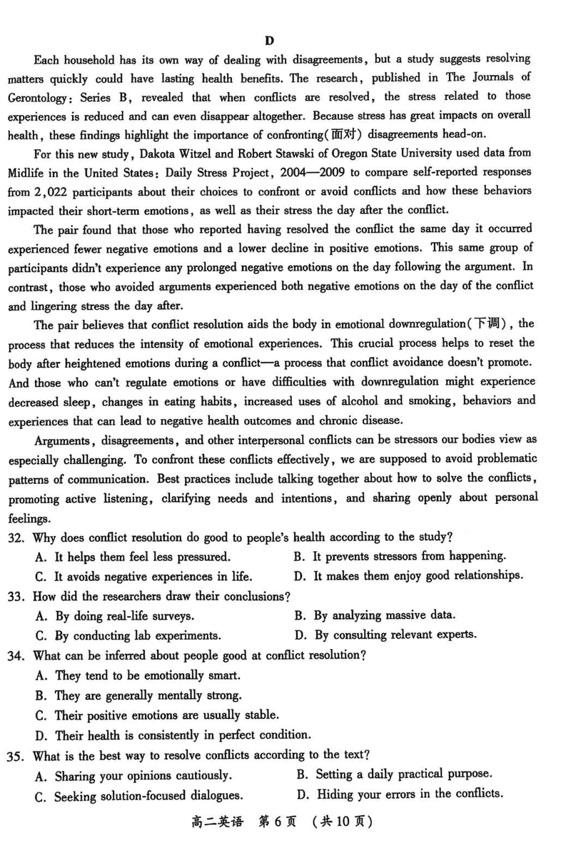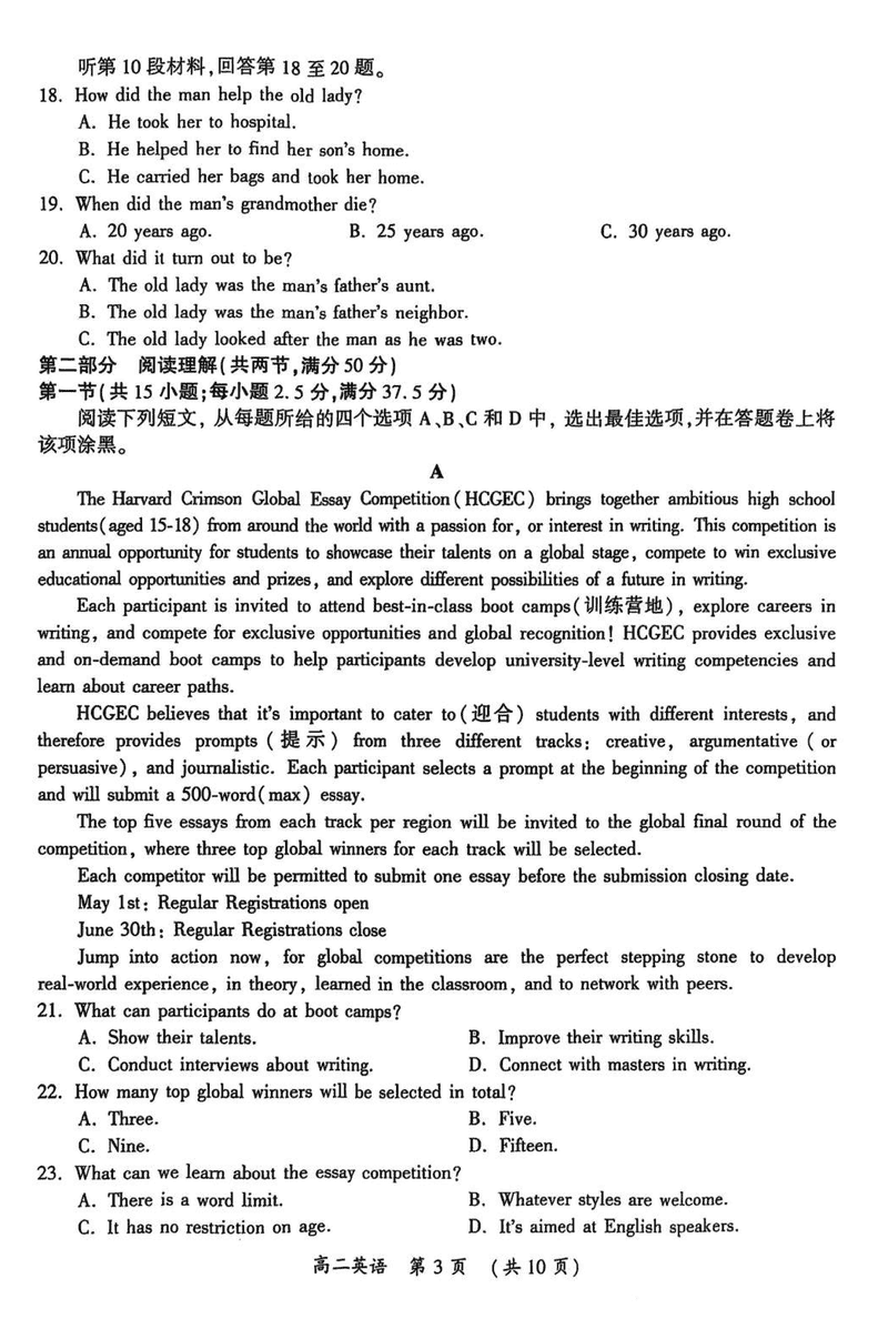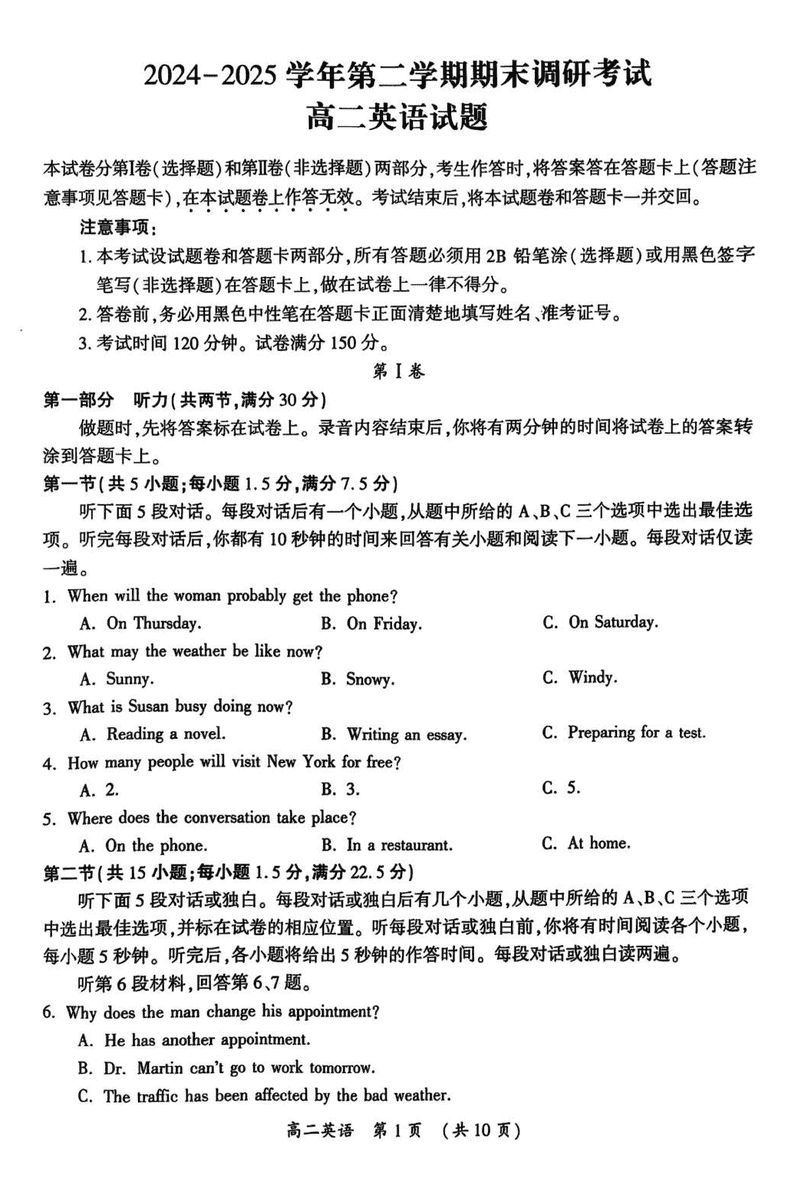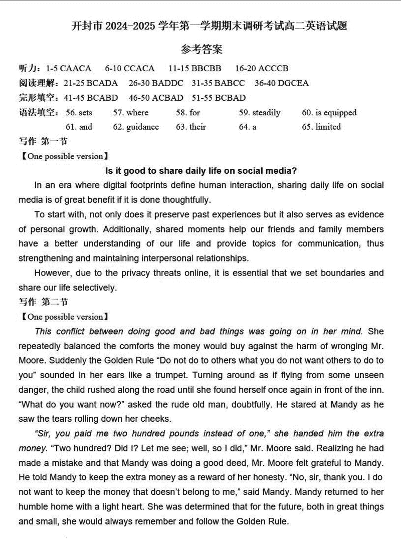 开封市2024-2025学年高二下学期期末调研英语试题及答案 时间:2025-07-09 河南 高中英语 河南省开封市2024-2025学年高二下学期期末调研英语考试已于近日开考,为方便考生考后及时查看考试情况,查漏补缺、弥补不足,本文整理了试题答案解析相关信息! 英语试题及答案解析