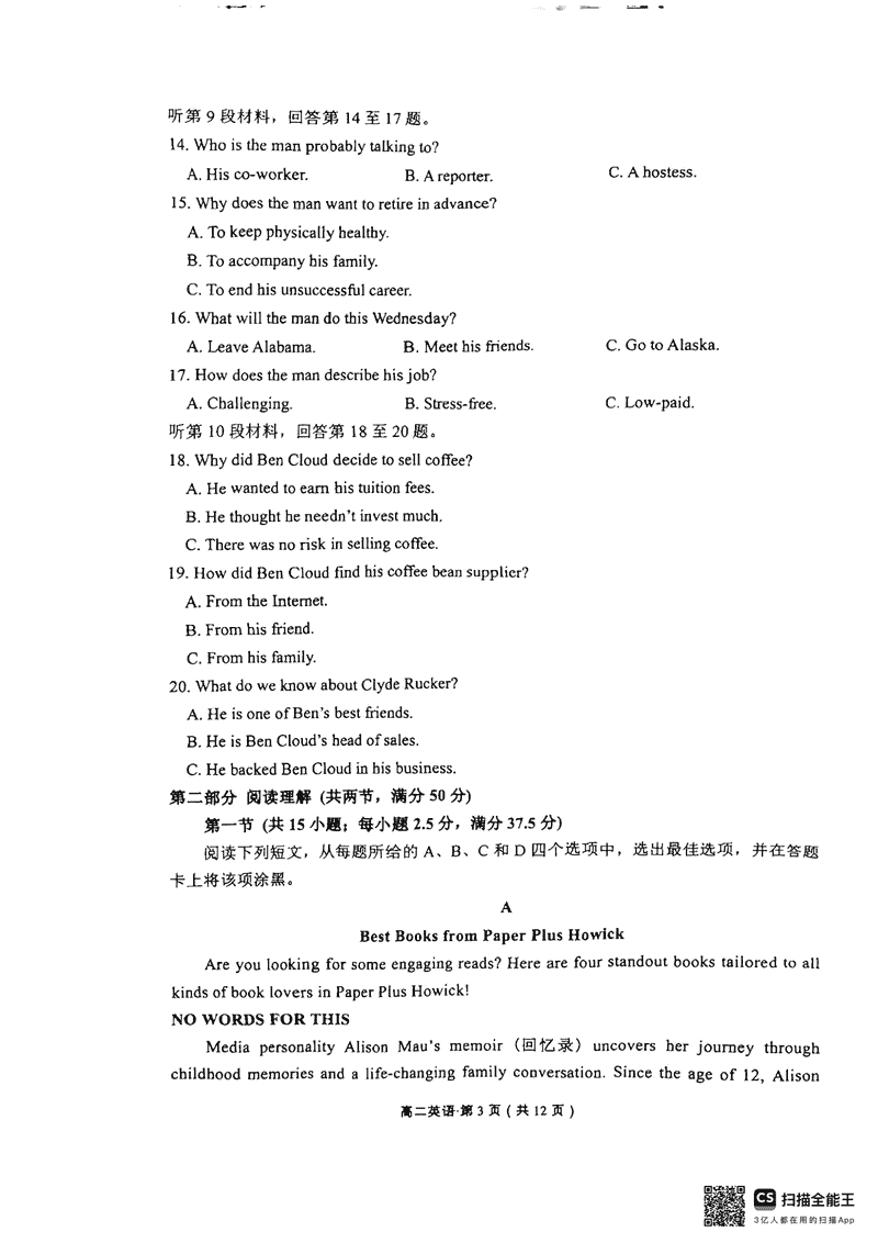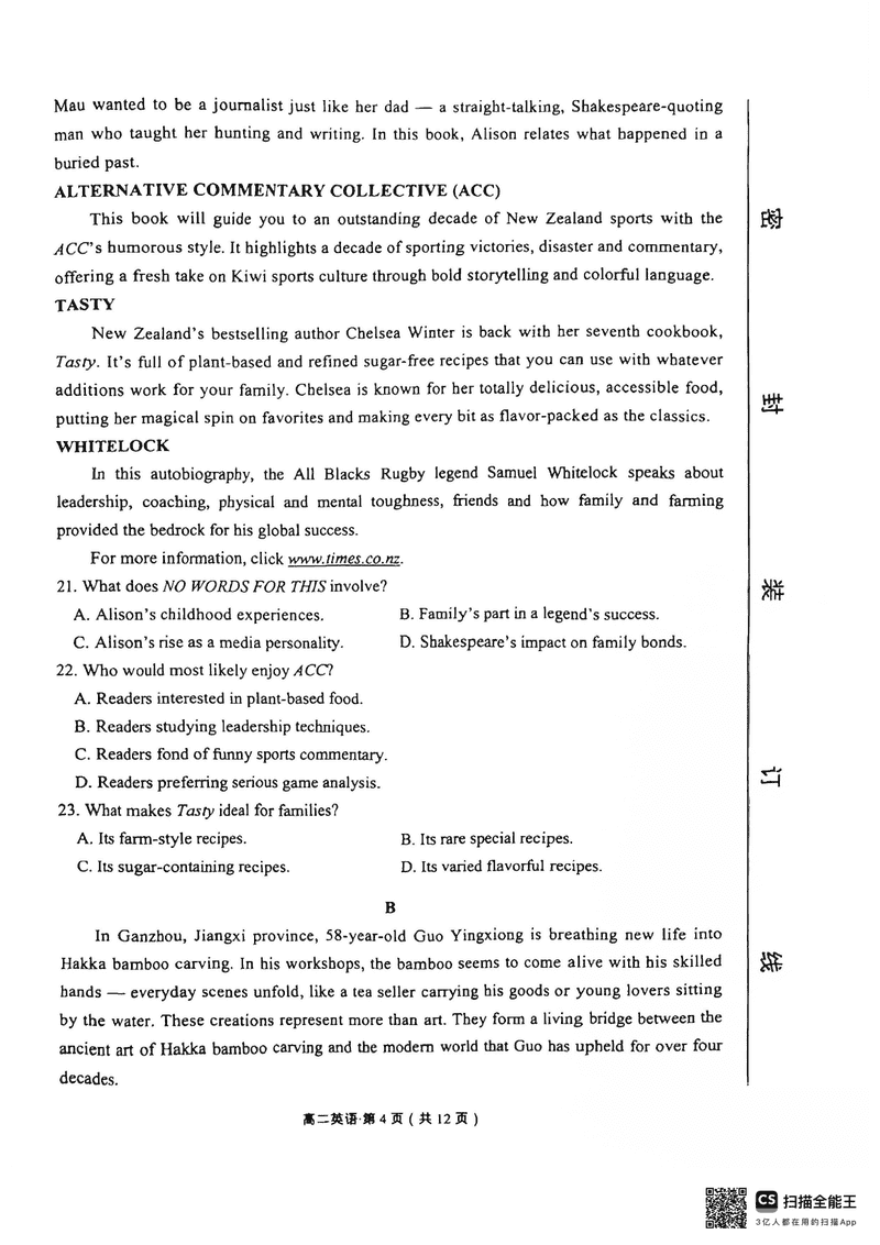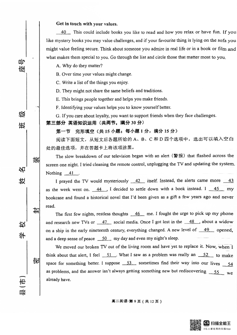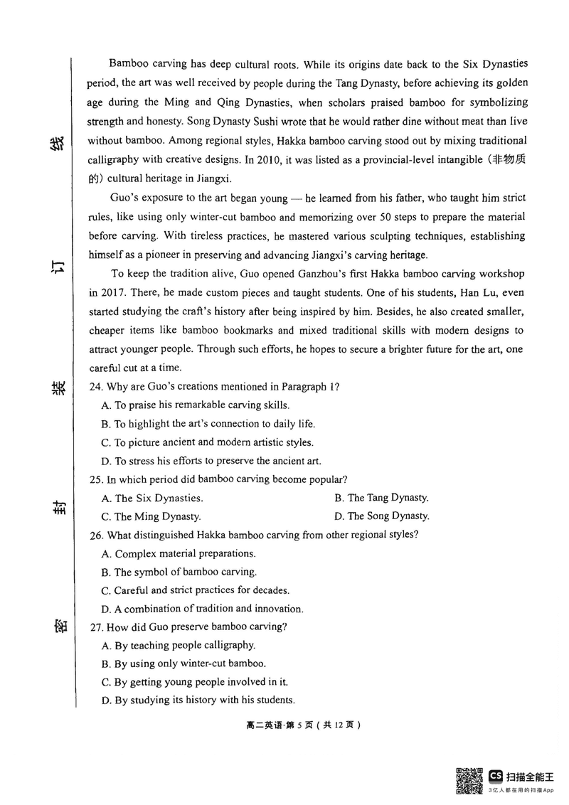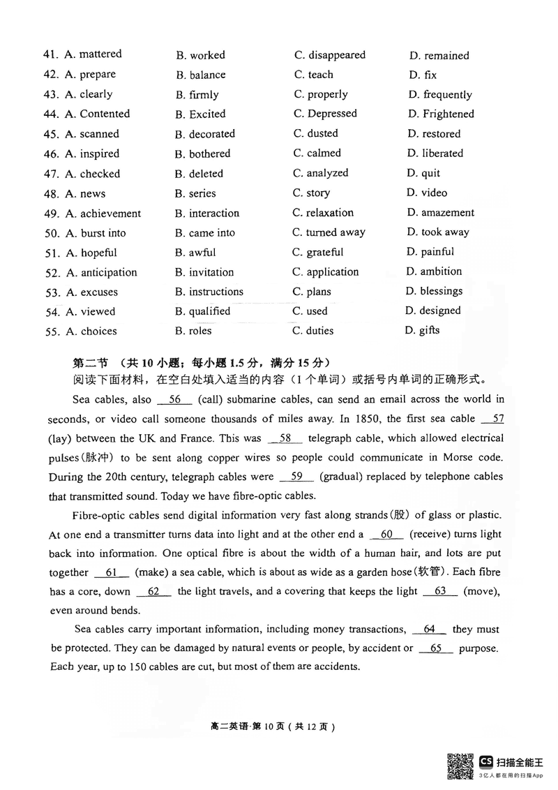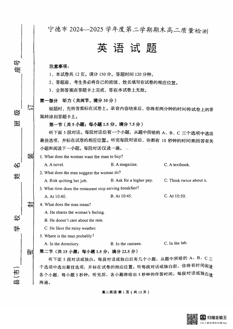 宁德市2024-2025学年高二下学期6月期末英语试题及答案 时间:2025-07-09 福建 高中英语 福建省宁德市2024-2025学年高二下学期6月期末质量检测英语考试已于近日开考,为方便考生考后及时查看考试情况,查漏补缺、弥补不足,本文整理了试题答案解析相关信息! 英语试题及答案解析