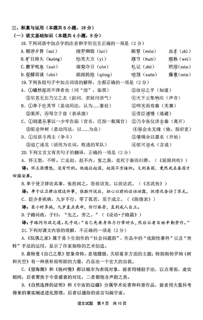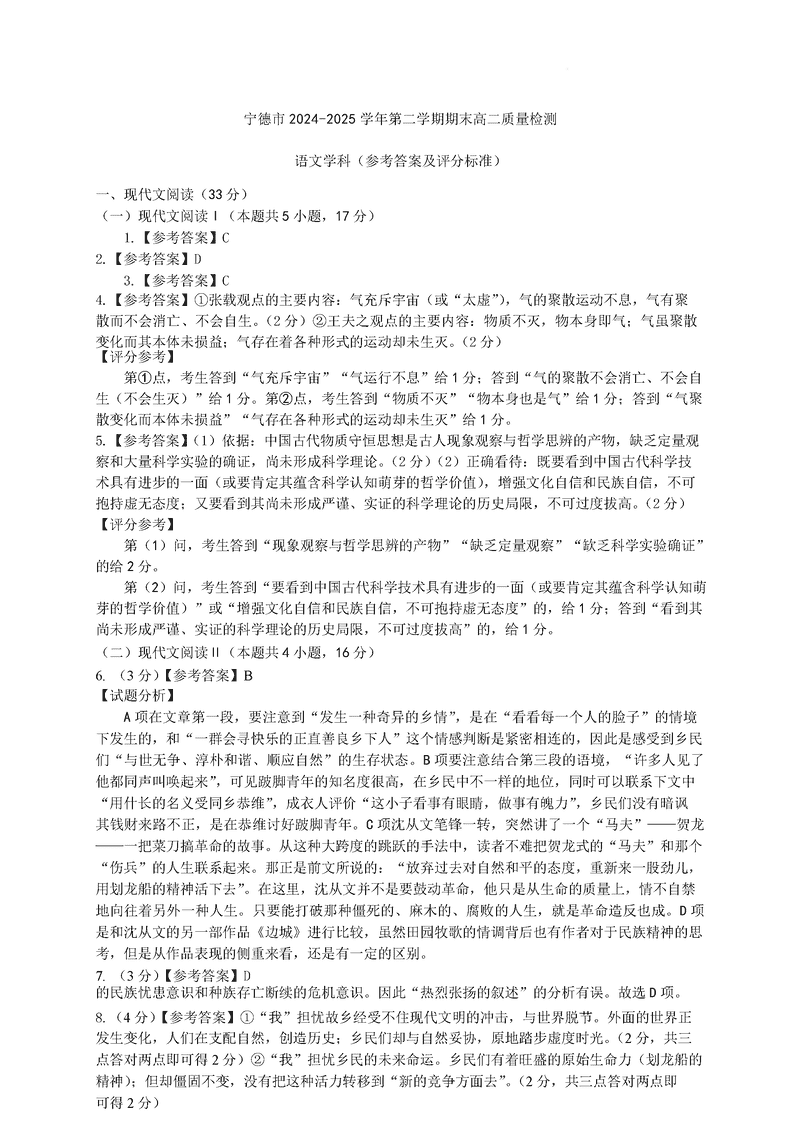 宁德市2024-2025学年高二下学期6月期末语文试题及答案 时间:2025-07-09 福建 高中语文 福建省宁德市2024-2025学年高二下学期6月期末质量检测语文考试已于近日开考,为方便考生考后及时查看考试情况,查漏补缺、弥补不足,本文整理了试题答案解析相关信息! 语文试题及答案解析