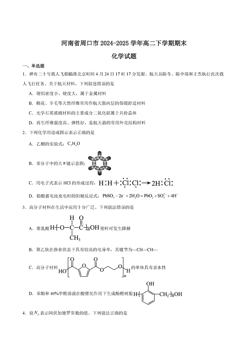 周口市2024-2025学年高二下学期6月期末化学试题及答案 时间:2025-07-09 河南 高中化学 河南省周口市2024-2025学年高二下学期6月期末摸底化学考试已于近日开考,为方便考生考后及时查看考试情况,查漏补缺、弥补不足,本文整理了试题答案解析相关信息! 化学试题及答案解析