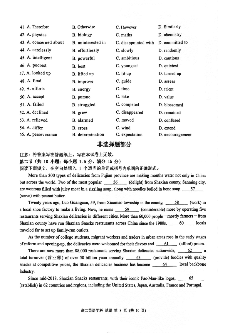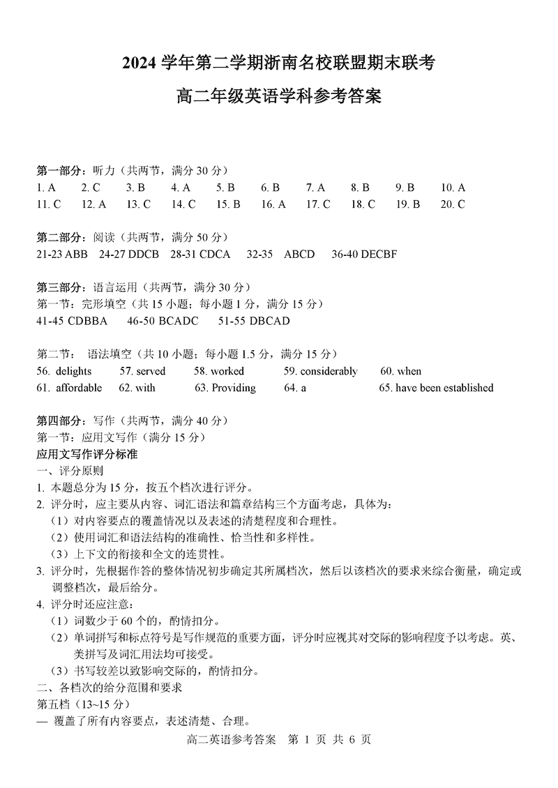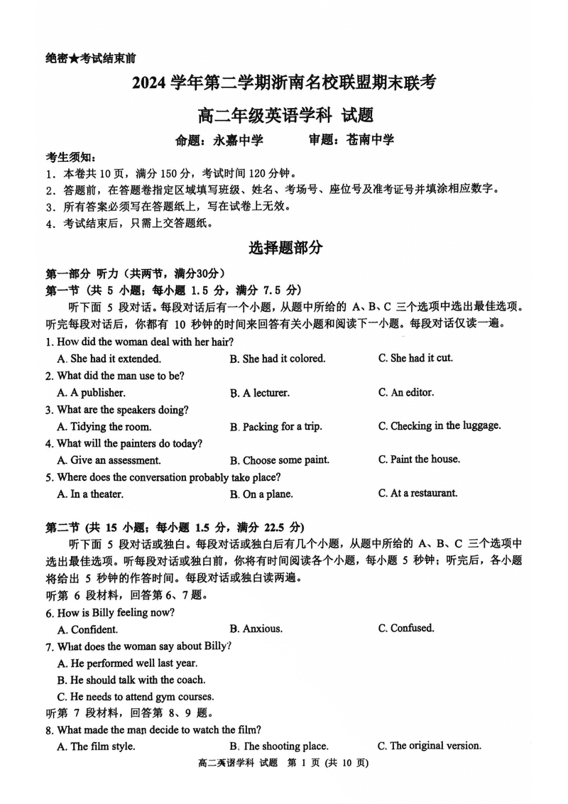 浙江浙南名校2024-2025学年高二下学期6月期末英语试题及答案 时间:2025-07-10 浙江 高中英语 浙江省温州市浙南名校2024-2025学年高二下学期6月期末英语考试已于近日开考,为方便考生考后及时查看考试情况,查漏补缺、弥补不足,本文整理了试题答案解析相关信息! 英语试题及答案解析
