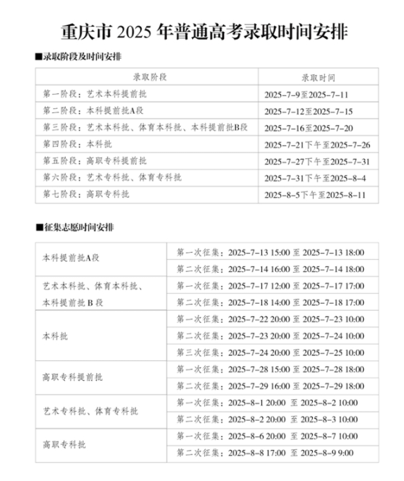 重庆2025年普通高考录取工作即将开始,将于8月11日结束,各类别各批次录取进程安排如下。高考录取工作将于7月9日开始,8月11日结束,涵盖艺术、体育、本科及高职专科等各类别批次。