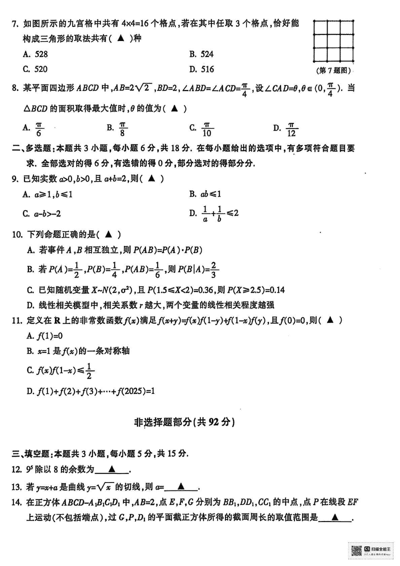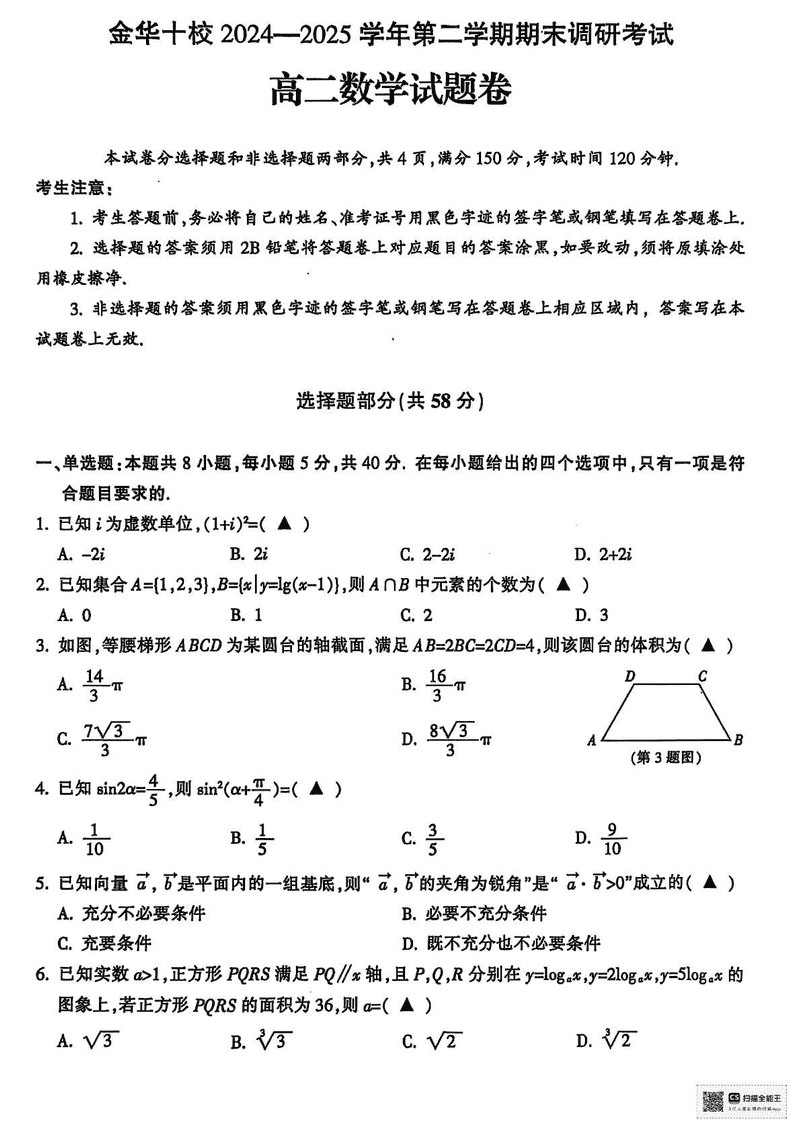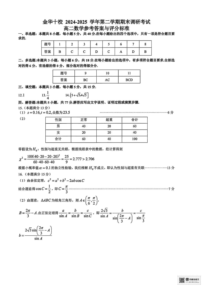 金华市十校2024-2025学年高二下学期6月期末调研数学试题及答案 时间:2025-07-10 浙江 高中数学 浙江省金华市十校2024-2025学年高二下学期6月期末调研数学考试已于近日开考,为方便考生考后及时查看考试情况,查漏补缺、弥补不足,本文整理了试题答案解析相关信息! 数学试题及答案解析