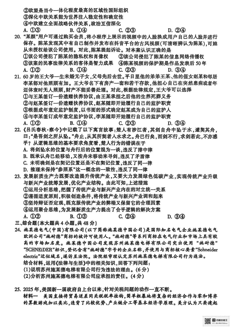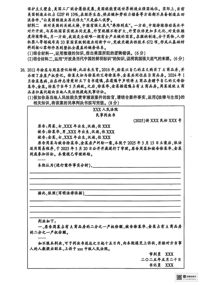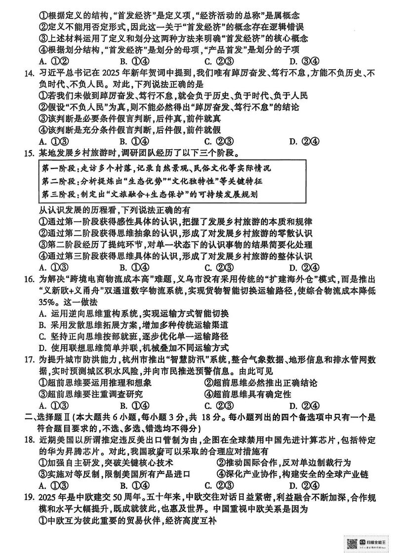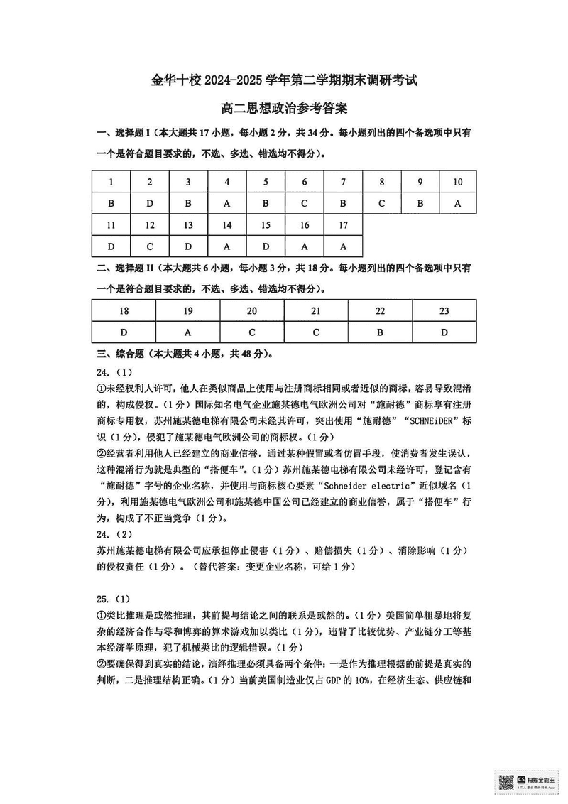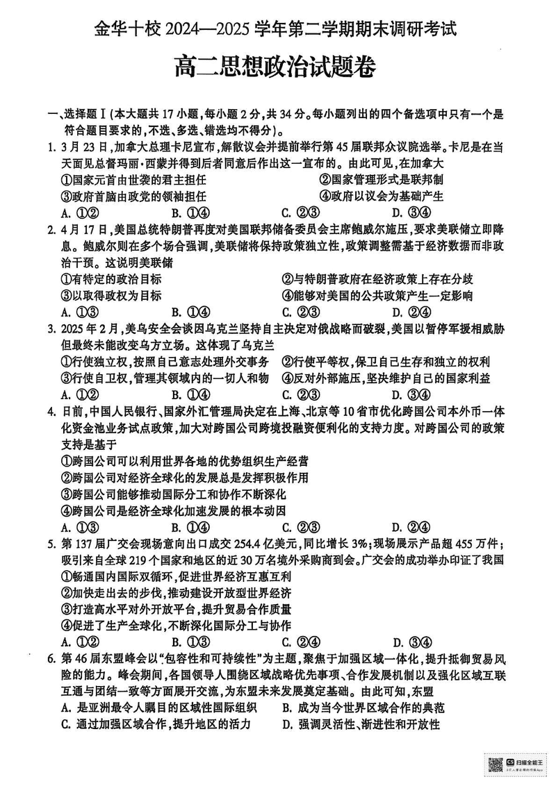 金华市十校2024-2025学年高二下学期6月期末调研政治试题及答案 时间:2025-07-10 浙江 高中政治 浙江省金华市十校2024-2025学年高二下学期6月期末调研政治考试已于近日开考,为方便考生考后及时查看考试情况,查漏补缺、弥补不足,本文整理了试题答案解析相关信息! 政治试题及答案解析