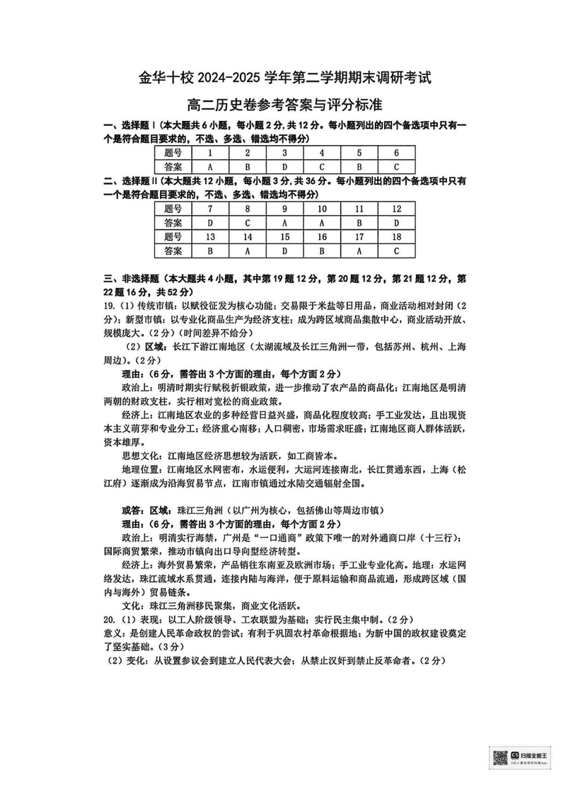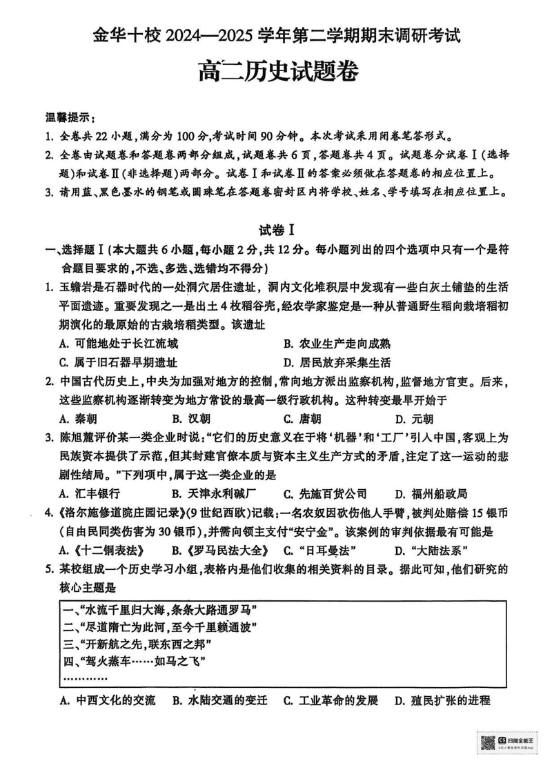 金华市十校2024-2025学年高二下学期6月期末调研历史试题及答案 时间:2025-07-10 浙江 高中历史 浙江省金华市十校2024-2025学年高二下学期6月期末调研历史考试已于近日开考,为方便考生考后及时查看考试情况,查漏补缺、弥补不足,本文整理了试题答案解析相关信息! 历史试题及答案解析