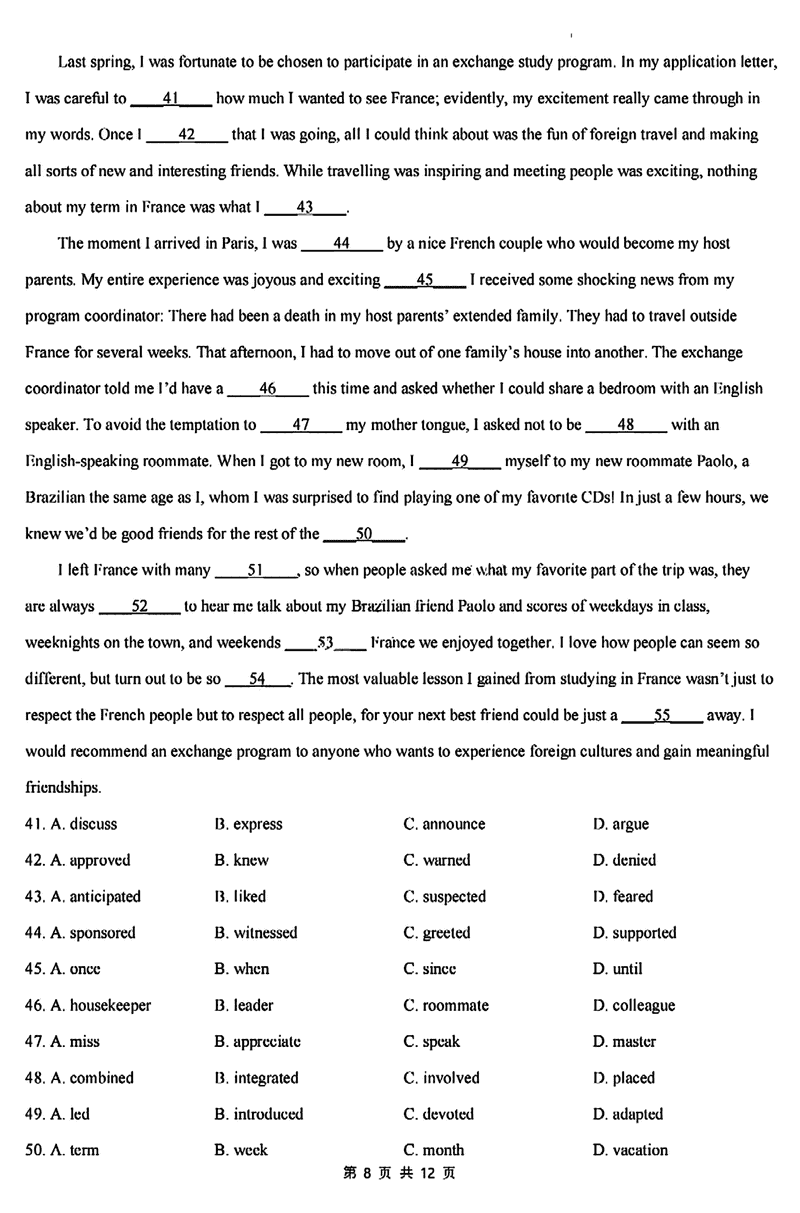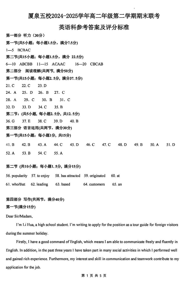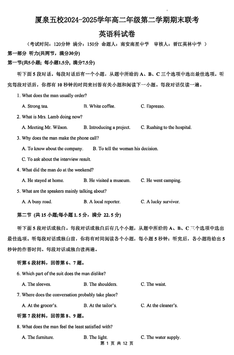 厦泉五校2024-2025学年高二下学期7月期末联考英语试题及答案 时间:2025-07-11 福建 高中英语 福建省厦泉五校2024-2025学年高二下学期7月期末联考英语考试已于近日开考,为方便考生考后及时查看考试情况,查漏补缺、弥补不足,本文整理了试题答案解析相关信息! 英语试题及答案解析