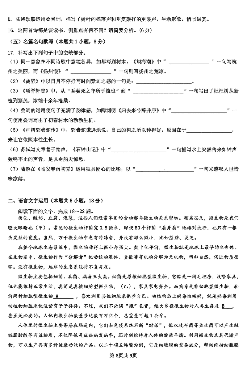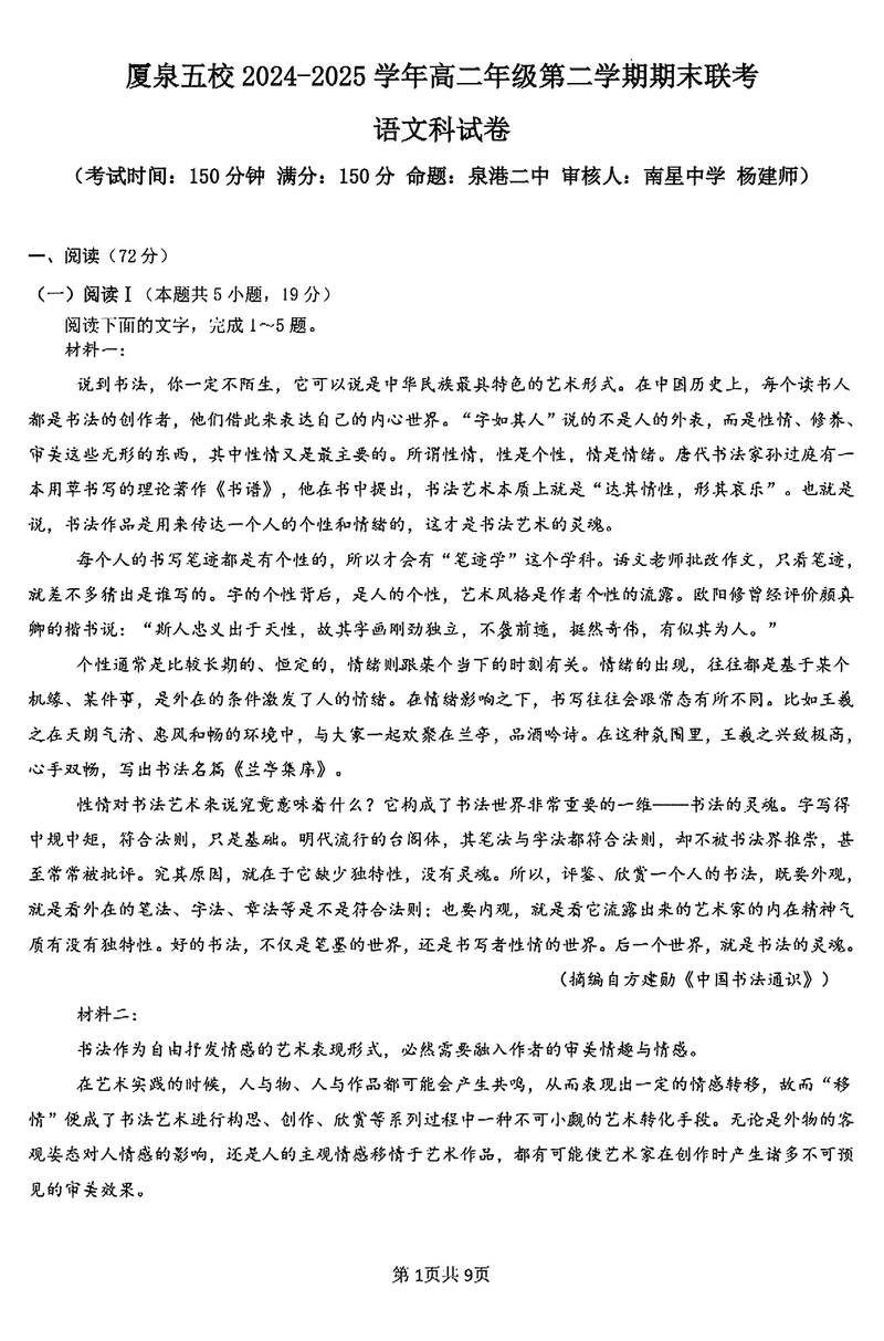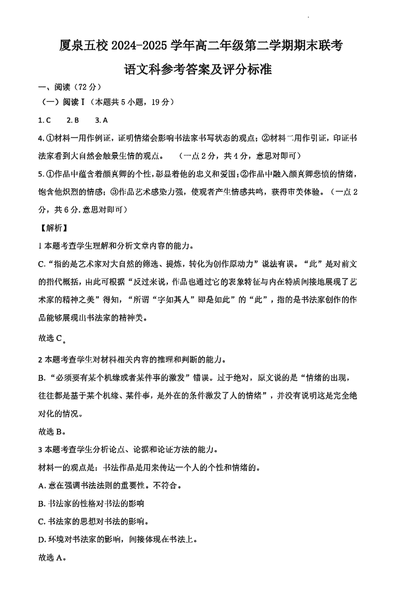 厦泉五校2024-2025学年高二下学期7月期末联考语文试题及答案 时间:2025-07-11 福建 高中语文 福建省厦泉五校2024-2025学年高二下学期7月期末联考语文考试已于近日开考,为方便考生考后及时查看考试情况,查漏补缺、弥补不足,本文整理了试题答案解析相关信息! 语文试题及答案解析