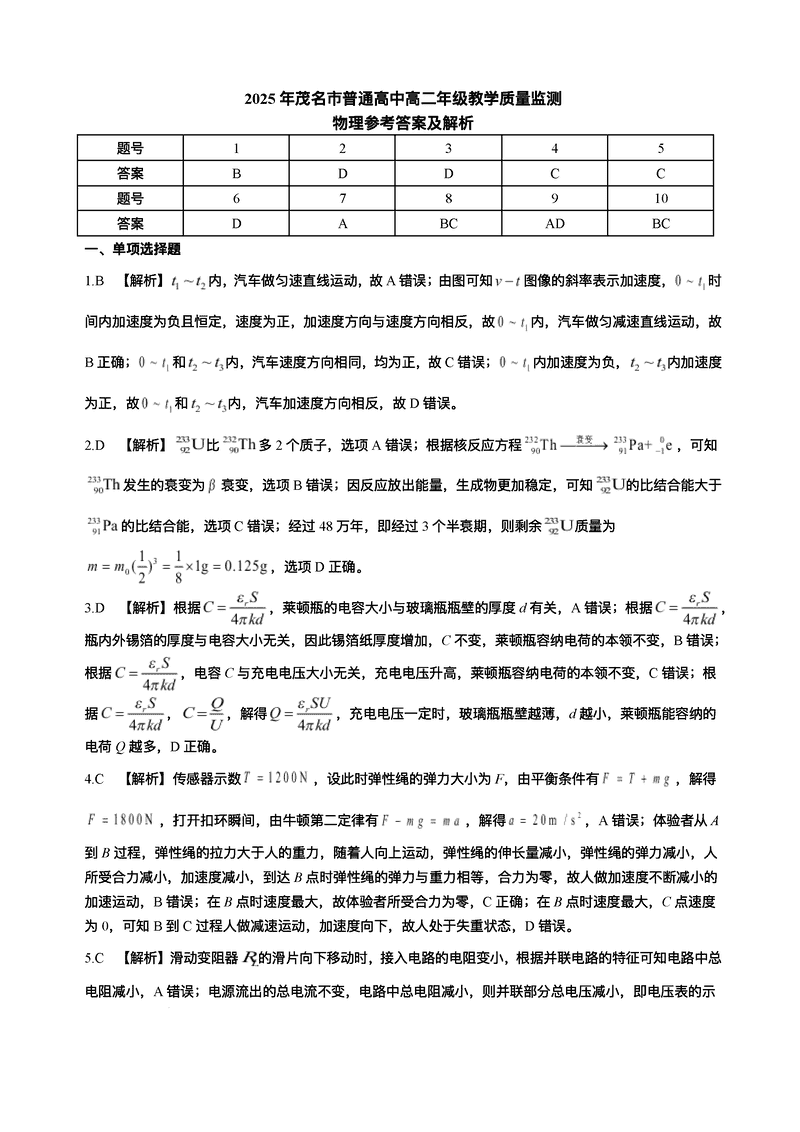 茂名市2025年高二下学期期末教学质量监测物理试题及答案 时间:2025-07-11 广东 高中物理 广东省茂名市2024-2025学年高二下学期期末教学质量监测物理考试已于近日开考,为方便考生考后及时查看考试情况,查漏补缺、弥补不足,本文整理了试题答案解析相关信息! 物理试题及答案解析
