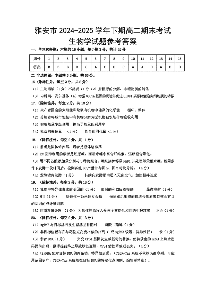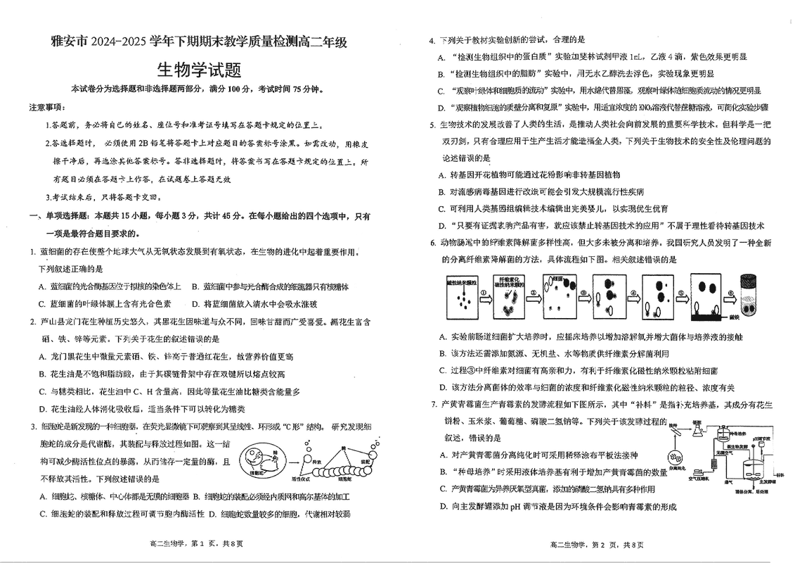 雅安市2024-2025学年高二下学期期末质检生物试题及答案 时间:2025-07-11 四川 高中生物 四川省雅安市2024-2025学年高二下学期期末教学质量检测生物考试已于近日开考,为方便考生考后及时查看考试情况,查漏补缺、弥补不足,本文整理了试题答案解析相关信息! 生物试题及答案解析