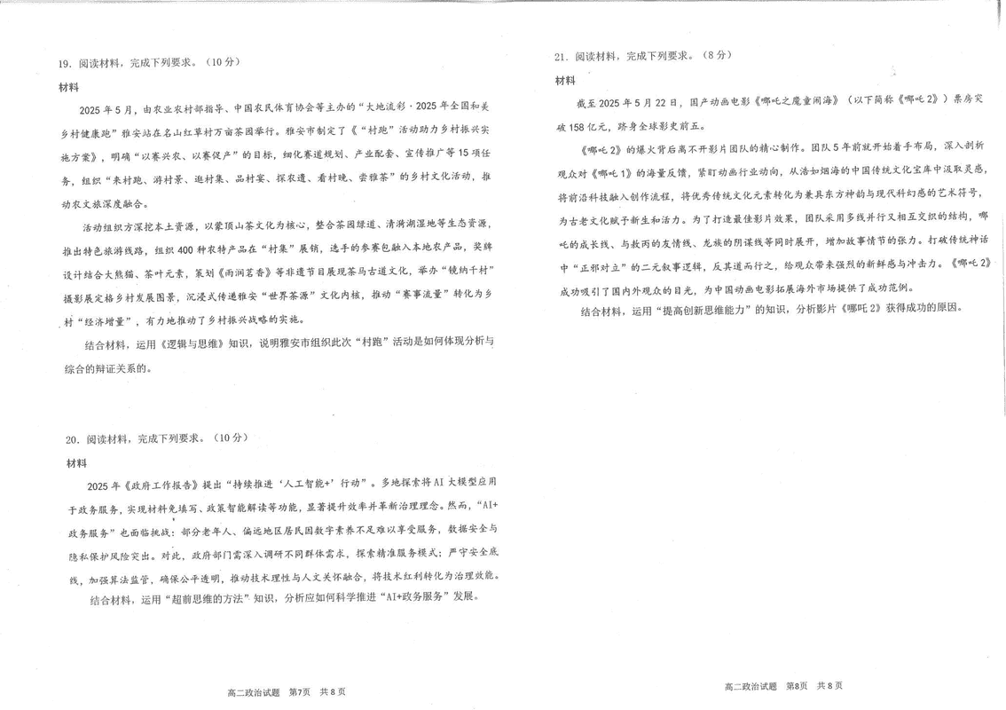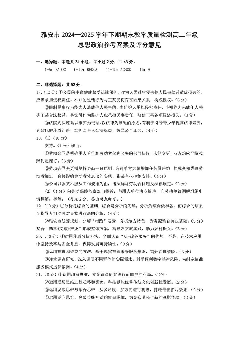 雅安市2024-2025学年高二下学期期末质检政治试题及答案 时间:2025-07-11 四川 高中政治 四川省雅安市2024-2025学年高二下学期期末教学质量检测政治考试已于近日开考,为方便考生考后及时查看考试情况,查漏补缺、弥补不足,本文整理了试题答案解析相关信息! 政治试题及答案解析