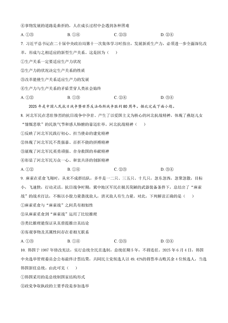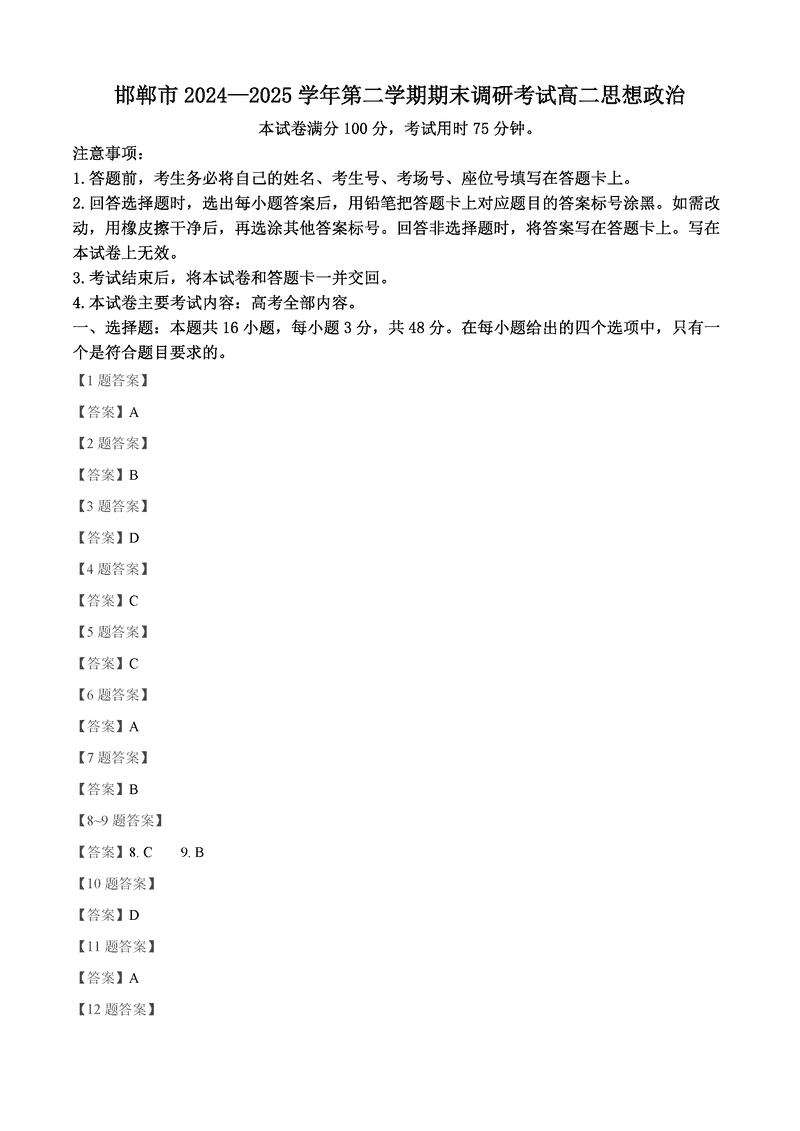 邯郸市2024-2025学年高二下学期期末政治试题及答案 时间:2025-07-11 河北 高中政治 河北省邯郸市2024-2025学年高二下学期期末调研政治考试已于近日开考,为方便考生考后及时查看考试情况,查漏补缺、弥补不足,本文整理了试题答案解析相关信息! 政治试题及答案解析