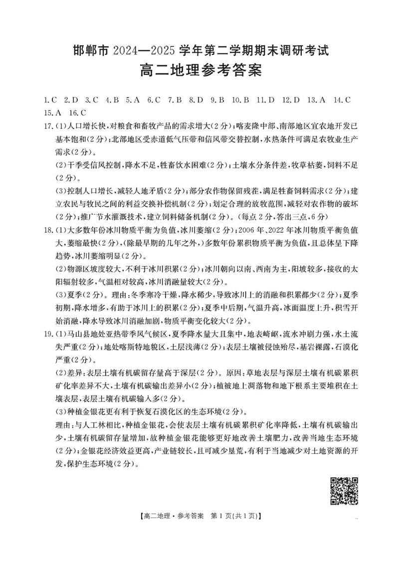 邯郸市2024-2025学年高二下学期期末地理试题及答案 时间:2025-07-11 河北 高中地理 河北省邯郸市2024-2025学年高二下学期期末调研地理考试已于近日开考,为方便考生考后及时查看考试情况,查漏补缺、弥补不足,本文整理了试题答案解析相关信息! 地理试题及答案解析