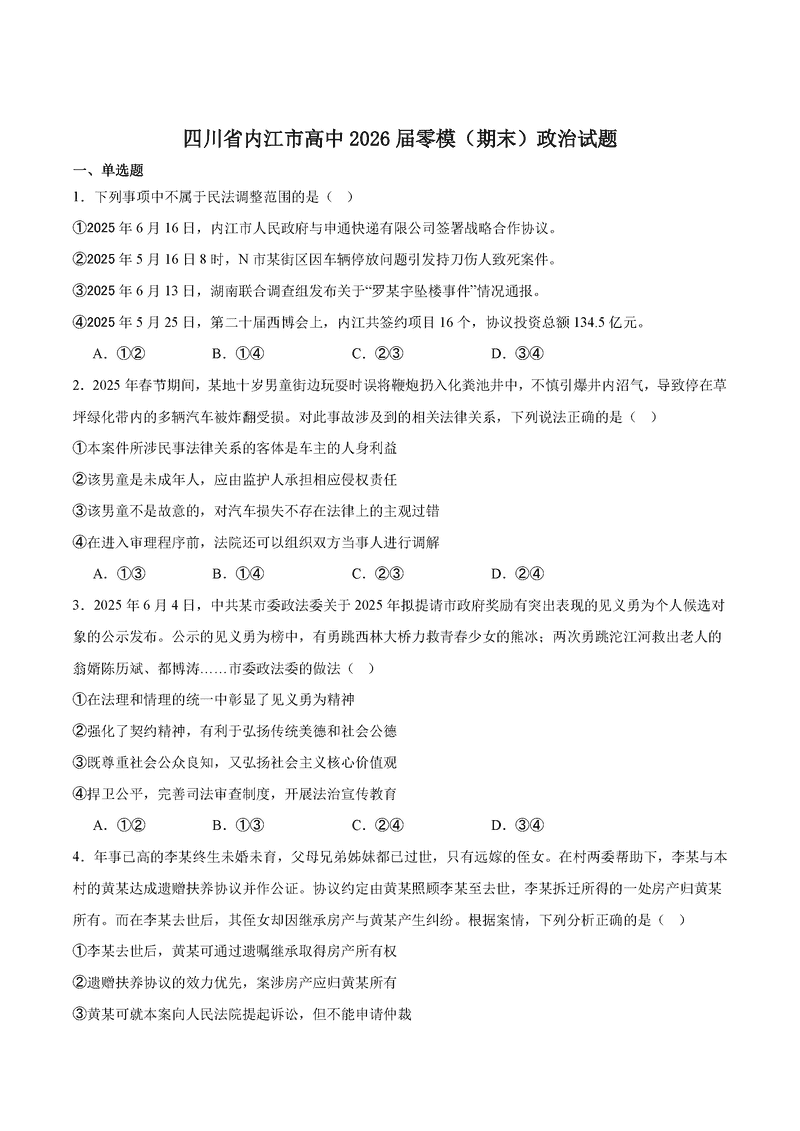 内江市2026届高三上学期零模政治试题及答案 时间:2025-07-13 四川 文综试题 四川内江市2026届高三上学期学期零模(高二下学期期末)政治考试已于近日开考,为方便考生考后及时查看考试情况,查漏补缺、弥补不足,本文整理了试题答案解析相关信息! 汇总:内江市2026届高三上学期学期零模试题及答案汇总 政治试题及答案解析