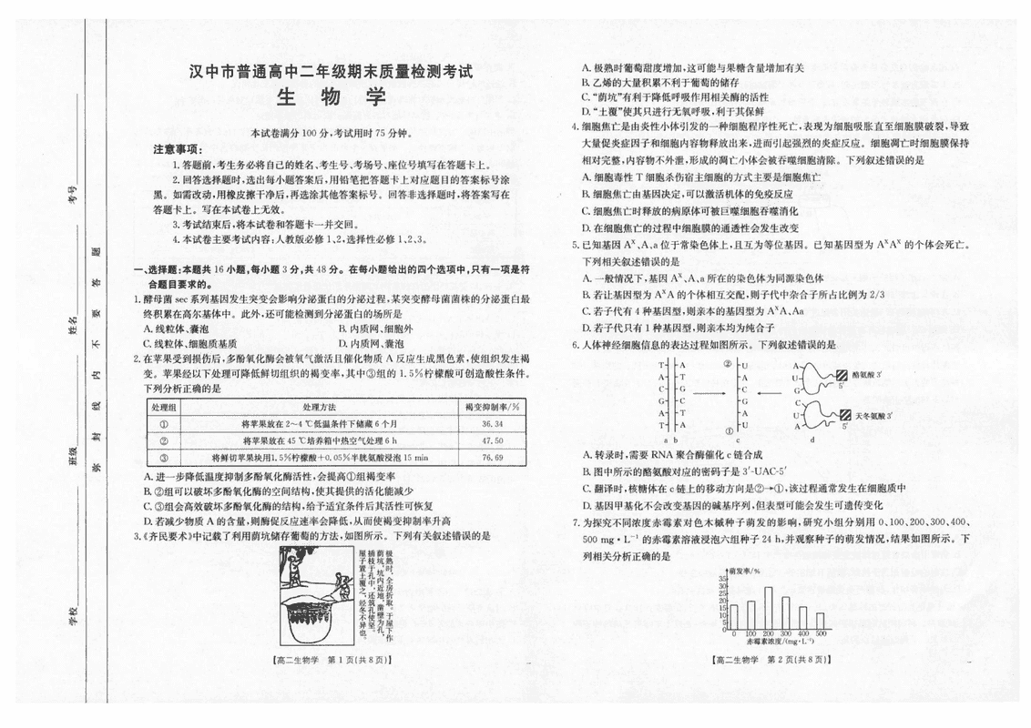 陕西汉中市2024-2025学年高二下学期期末生物考试已于近日开考,为方便考生考后及时查看考试情况,查漏补缺、弥补不足,本文整理了试题答案解析相关信息!