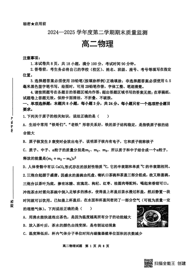 山东省东营市2024-2025学年高二下学期期末质量监测物理考试已于近日开考,为方便考生考后及时查看考试情况,查漏补缺、弥补不足,本文整理了试题答案解析相关信息!