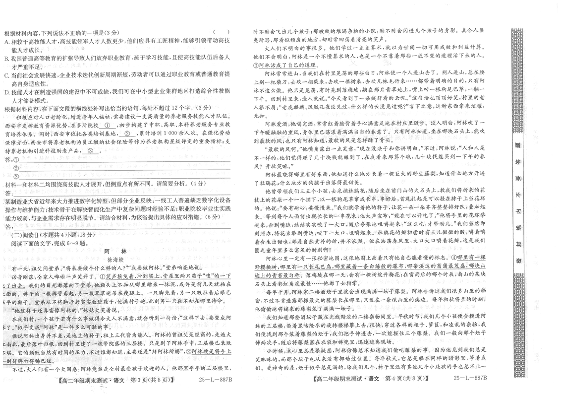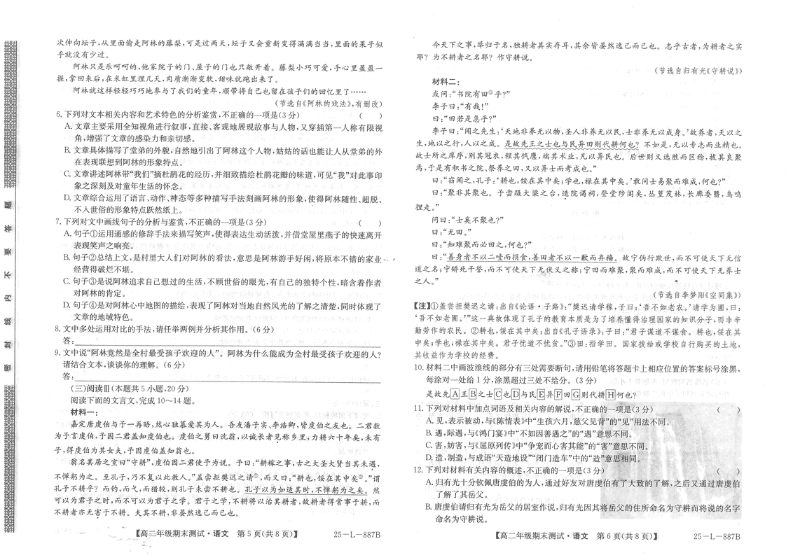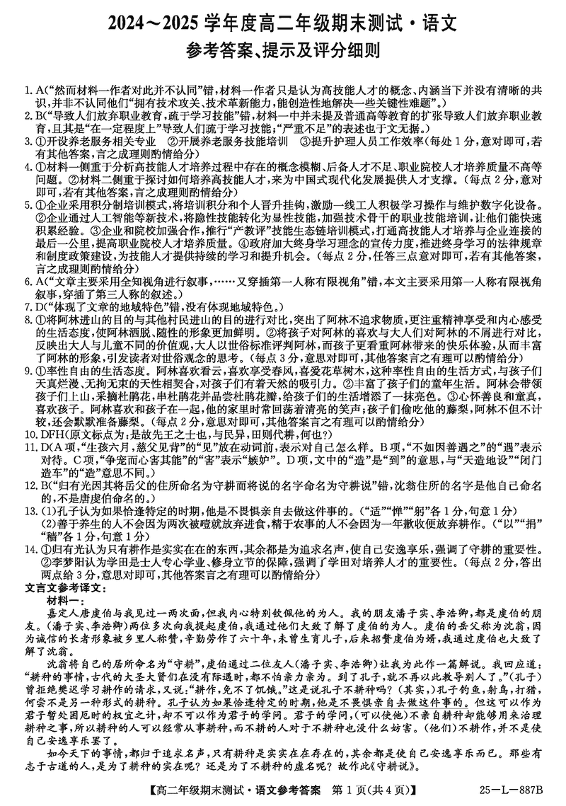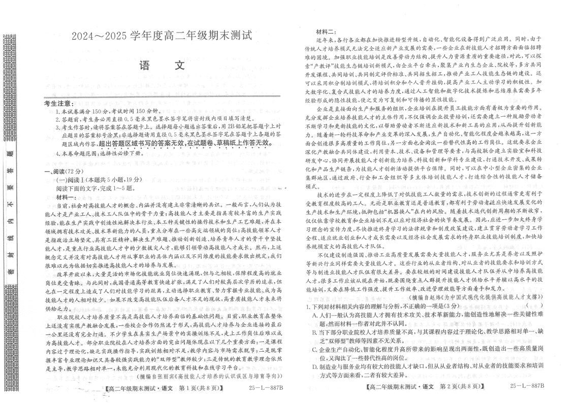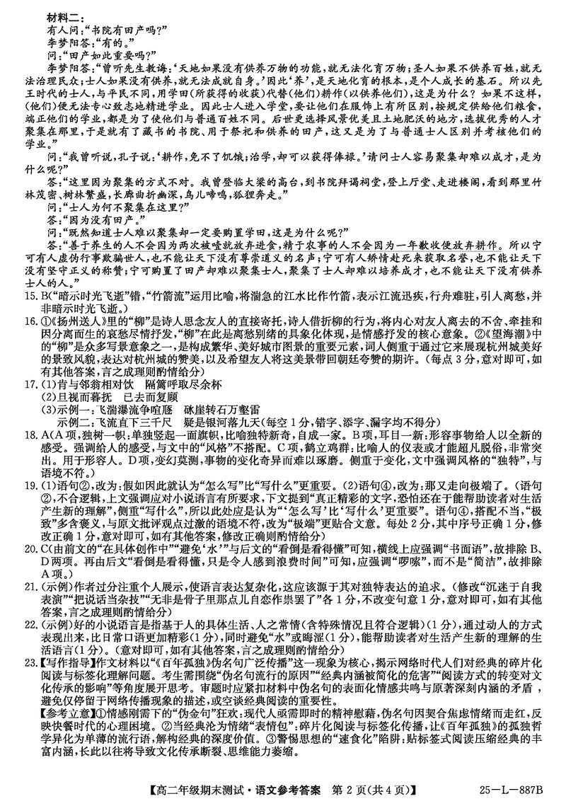 河北卓越联盟2024-2025学年度高二期末语文试题及答案