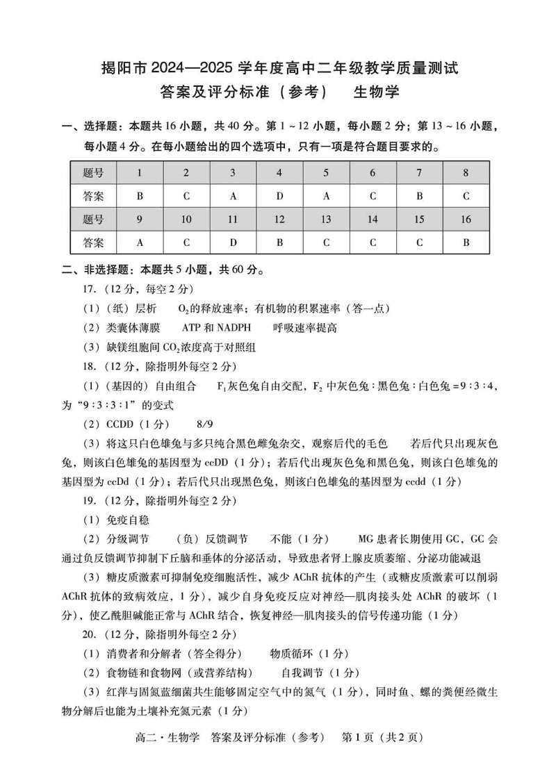 广东省揭阳市2024-2025学年高二下学期期末教学质量生物测试已于近日开考,为方便考生考后及时查看考试情况,查漏补缺、弥补不足,本文整理了试题答案解析相关信息!
