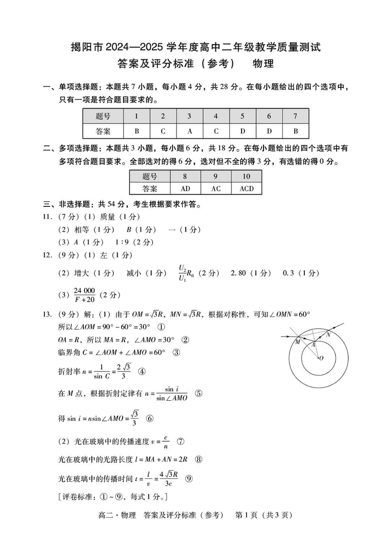 揭阳市2024-2025学年高二下学期期末物理试题及答案