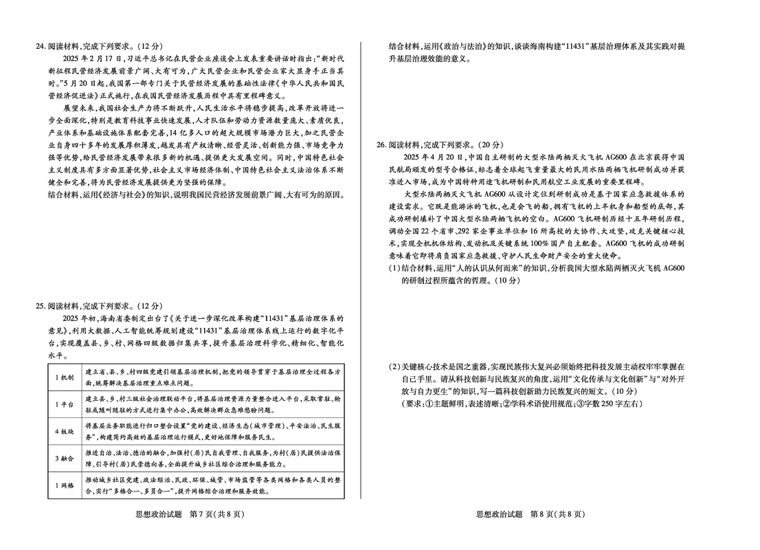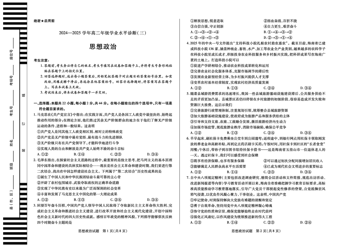 天一大联考·海南省2024-2025学年高二下学期学业水平诊断(三)政治试题及答案