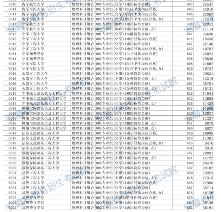 军队院校:22所军校在安徽招生938人,其中历史类10人,物理类928人。国防科技大学历史类招9人,最低投档线596分;物理类招78人,最低投档线642分。武警警官学院物理类投档线579分,为军校中最低。