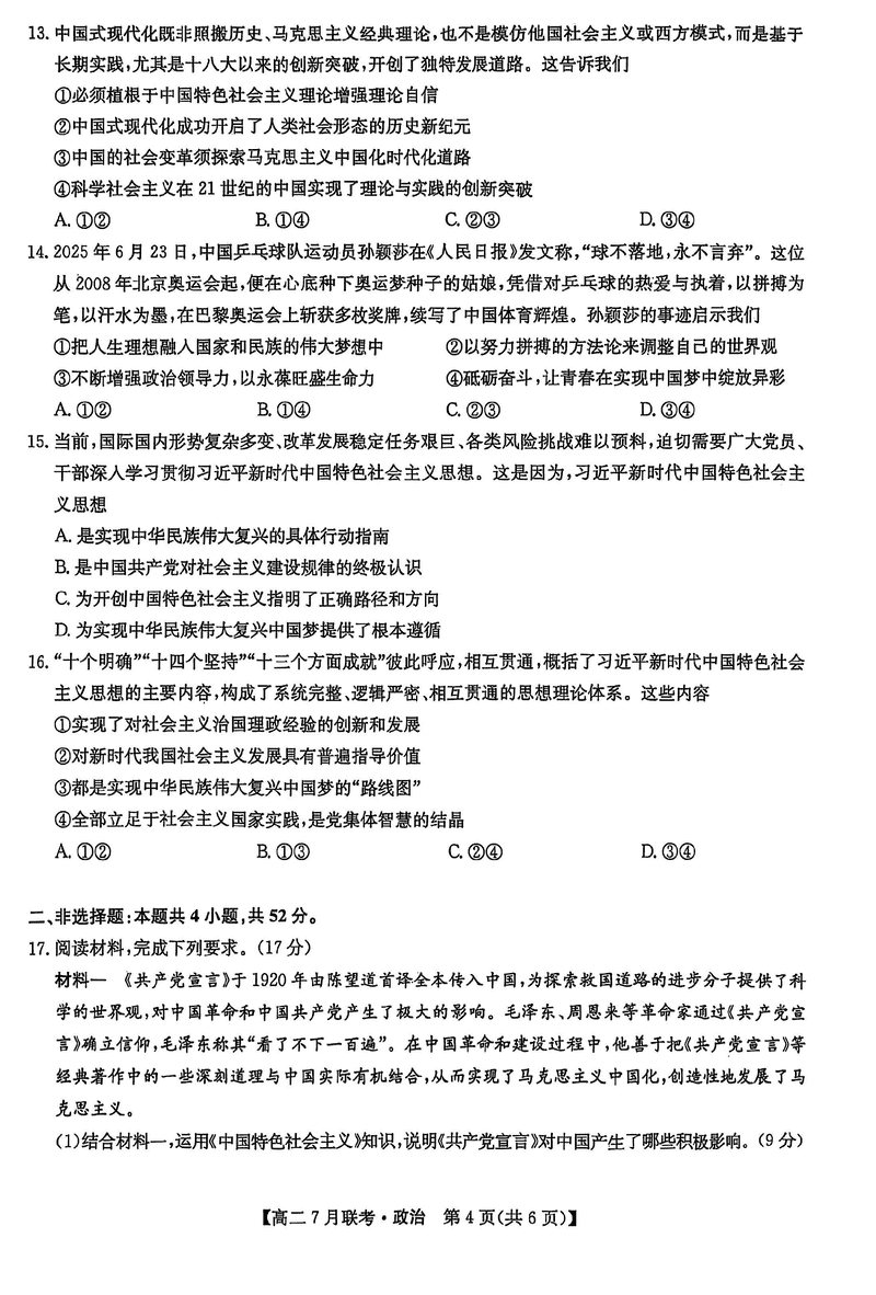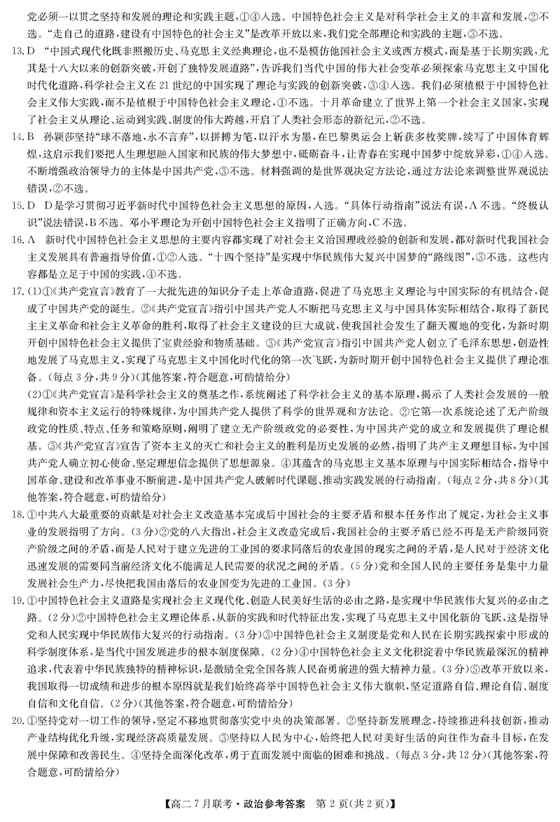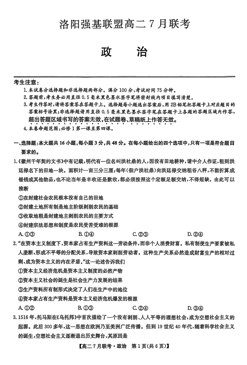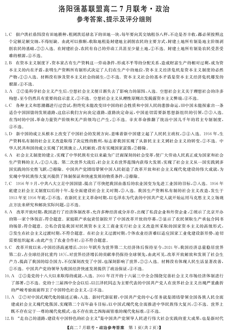 洛阳强基联盟2025年高二7月联考政治试题及答案 时间:2025-07-14 河南 文综试题 河南洛阳强基联盟2025年高二7月联考政治考试已于近日开考,为方便考生考后及时查看考试情况,查漏补缺、弥补不足,本文整理了试题答案解析相关信息! 汇总:河南洛阳市强基联盟2025年高二7月联考 政治试题及答案解析