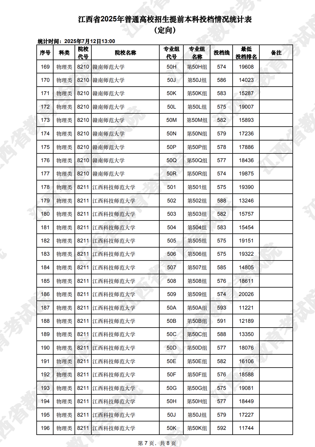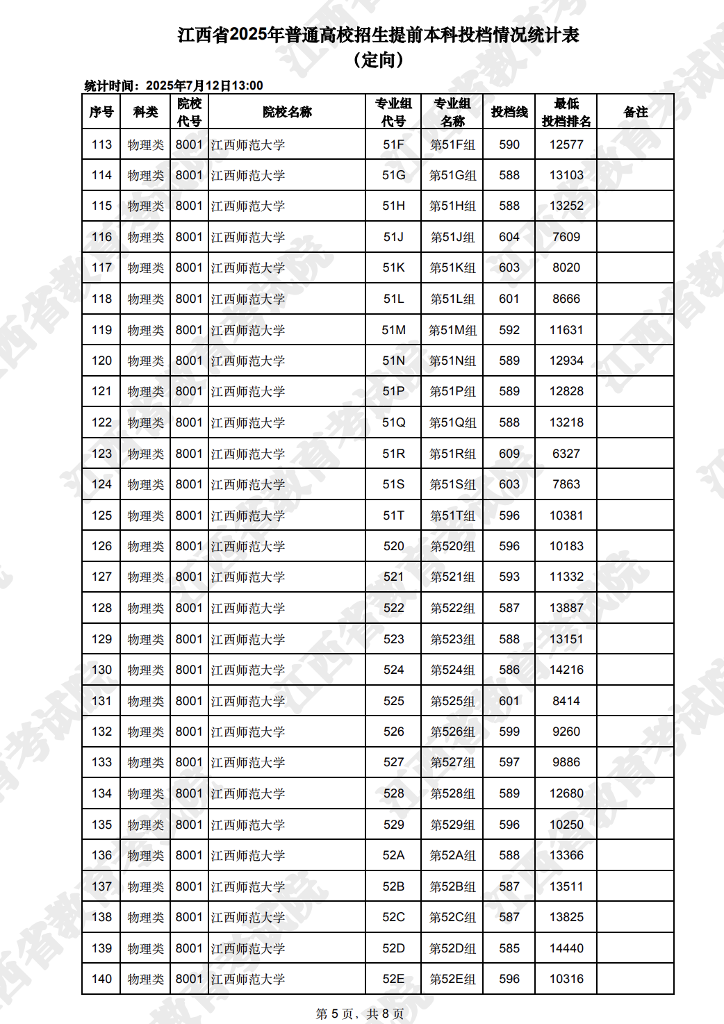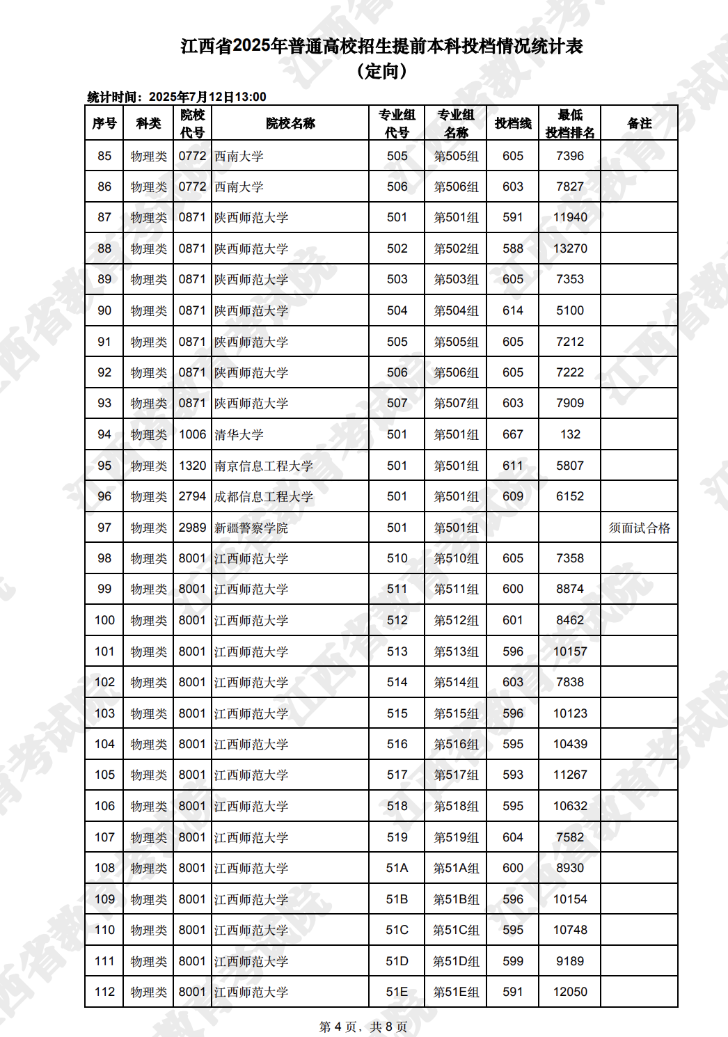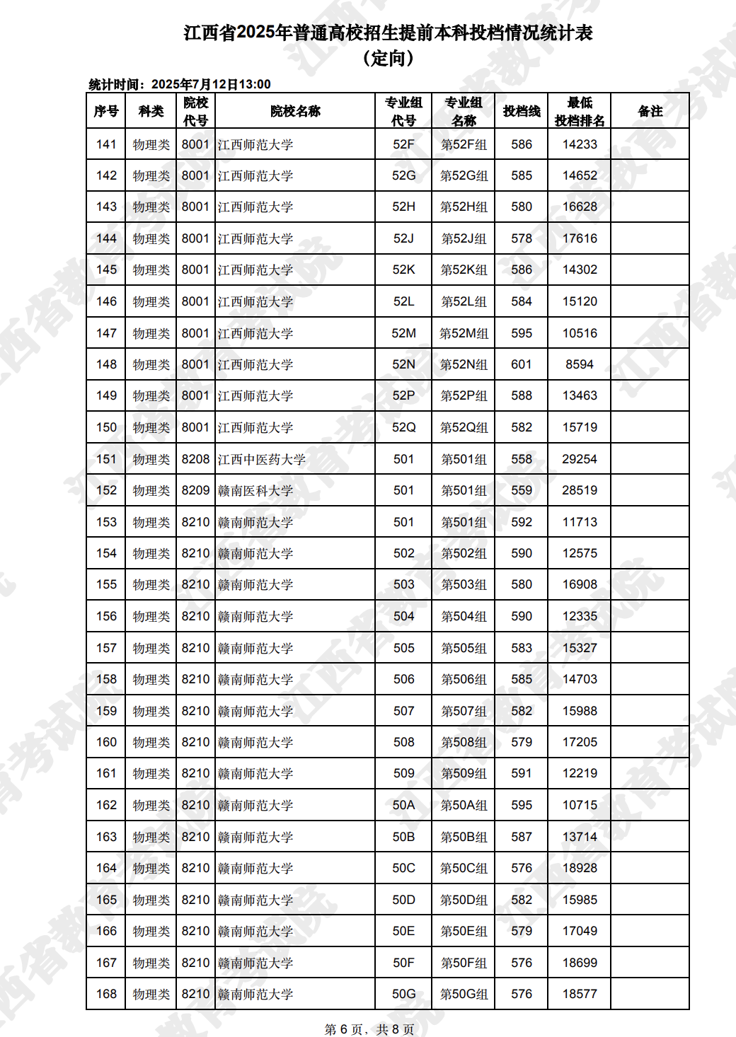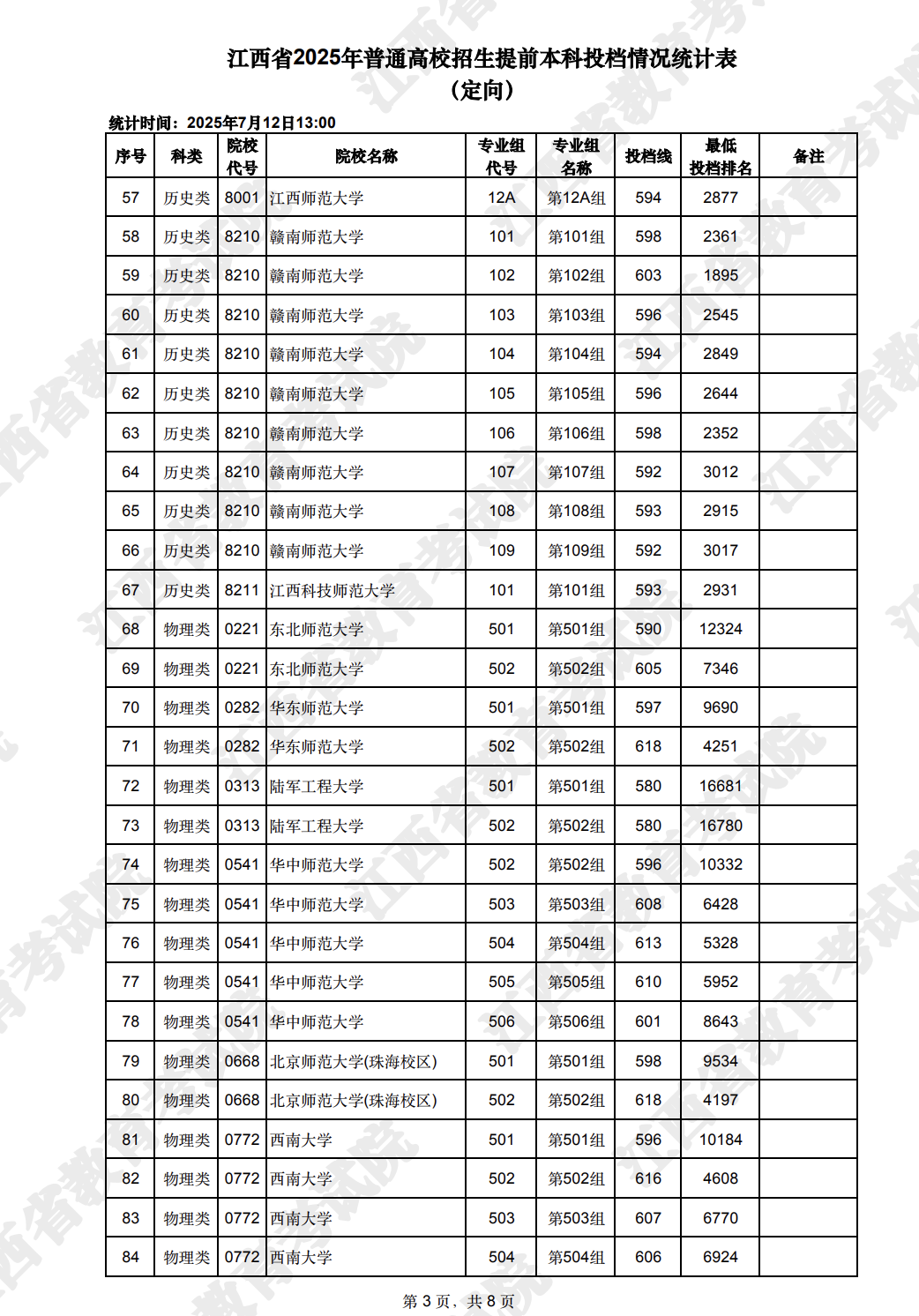 江西省2025年普通高校招生提前本科投档情况(定向)