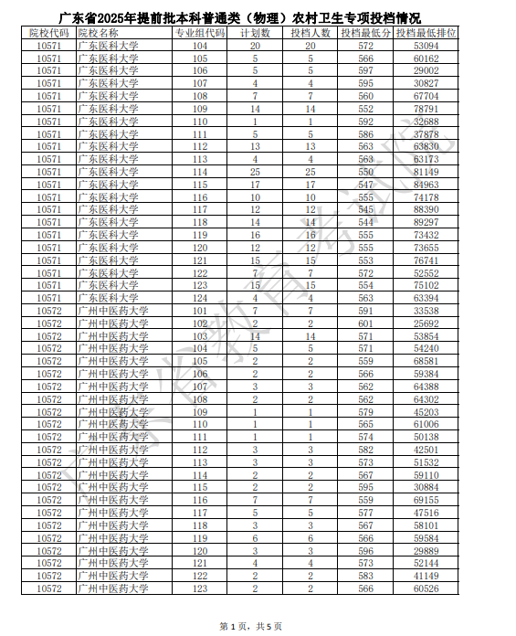 广东省2025年提前批本科普通类农村卫生专项投档线(物理)