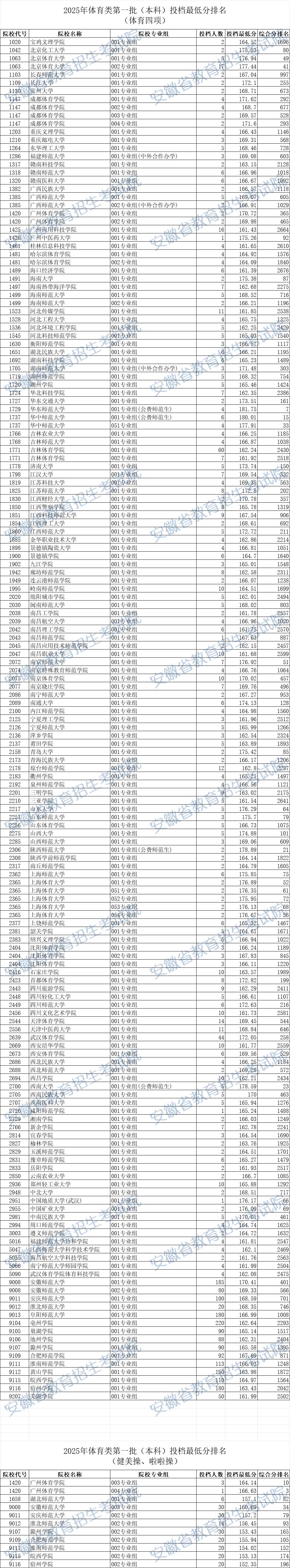 安徽2025年体育类第一批(本科)投档最低分排名(体育四项)、(健美操、啦啦操)均已公布,详细信息如下:
