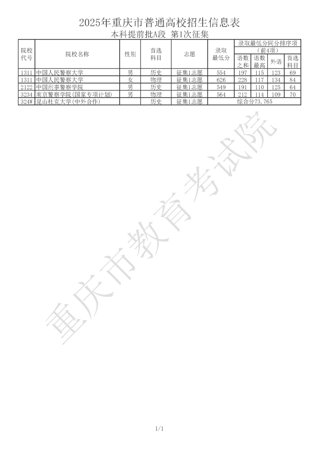 2025年重庆市普通高校招生信息表 普通类本科提前批A段(第1次征集)已发布,具体内容如下: