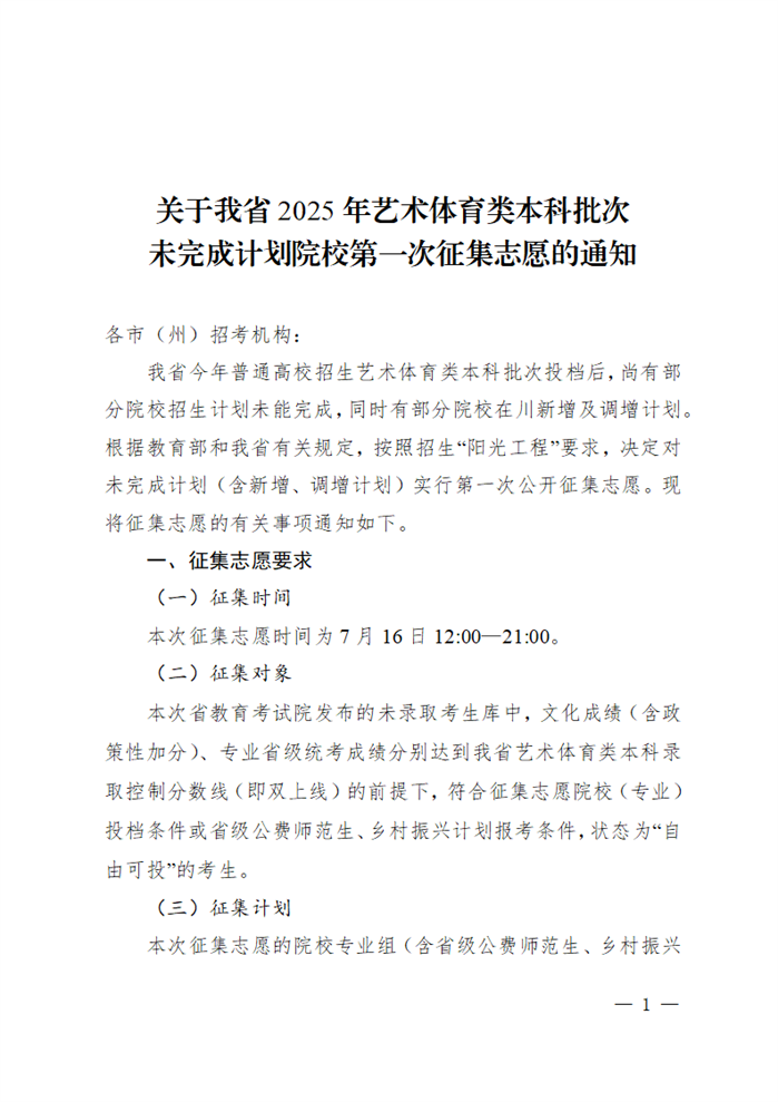 四川省 2025年艺术体育类本科批次未完成计划院校第一次征集志愿的通知,具体内容如下: