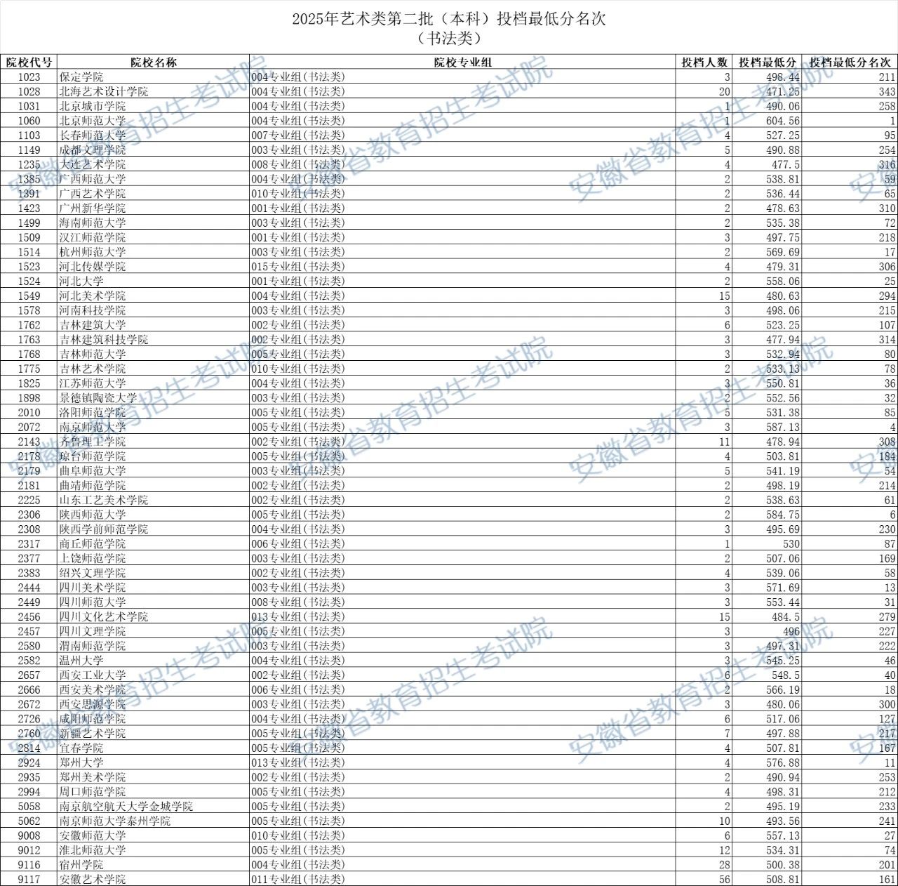 安徽2025年艺术类第二批(本科)投档最低分名次(书法类)