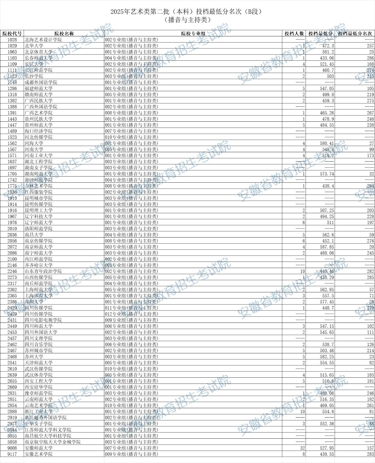 安徽2025年艺术类第二批(本科)投档最低分名次(B段)(播音与主持类) 时间:2025-07-16 安徽 高考新闻 安徽2025年艺术类第二批(本科)投档最低分名次(B段)(播音与主持类)已公布,具体内容如下: