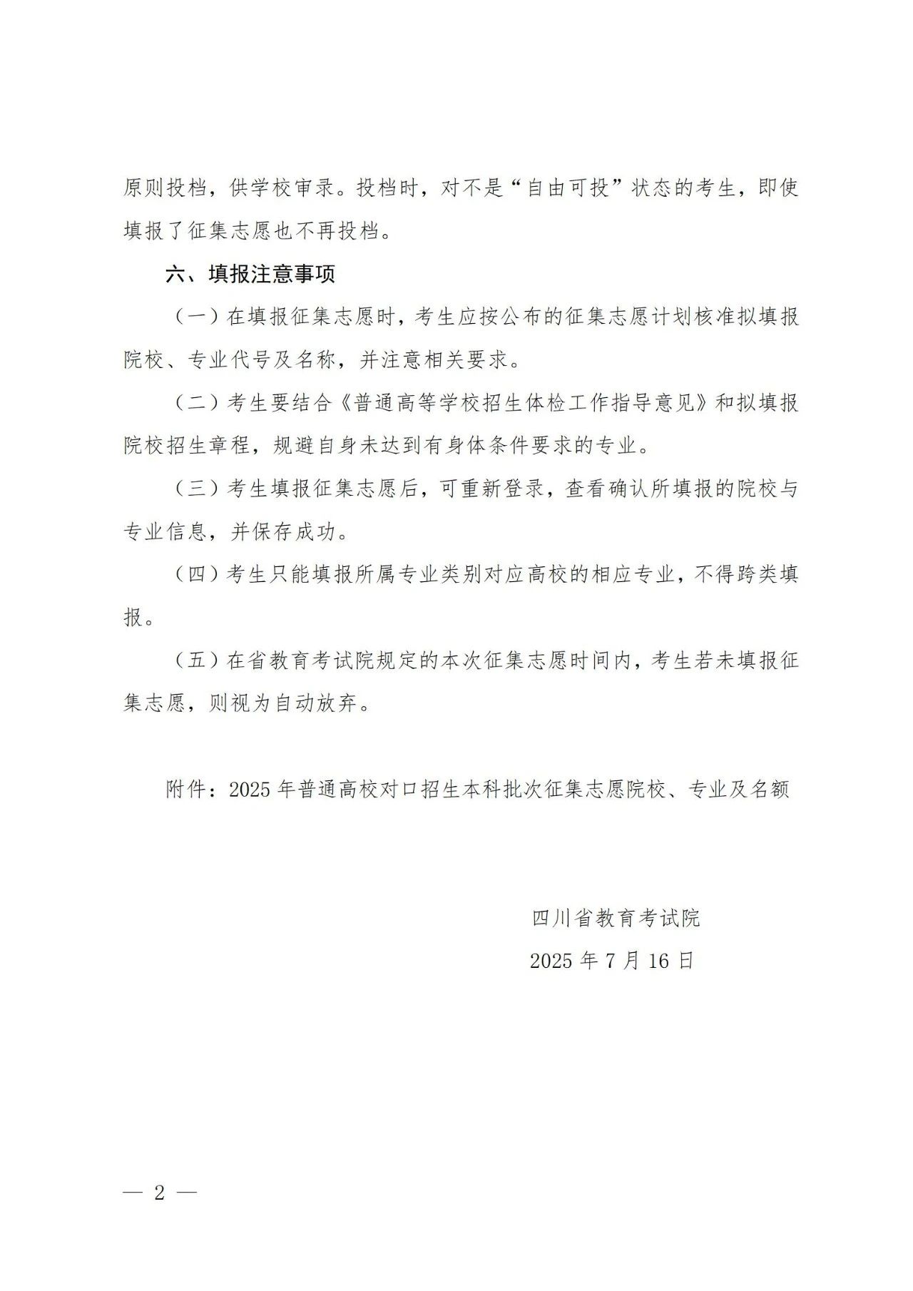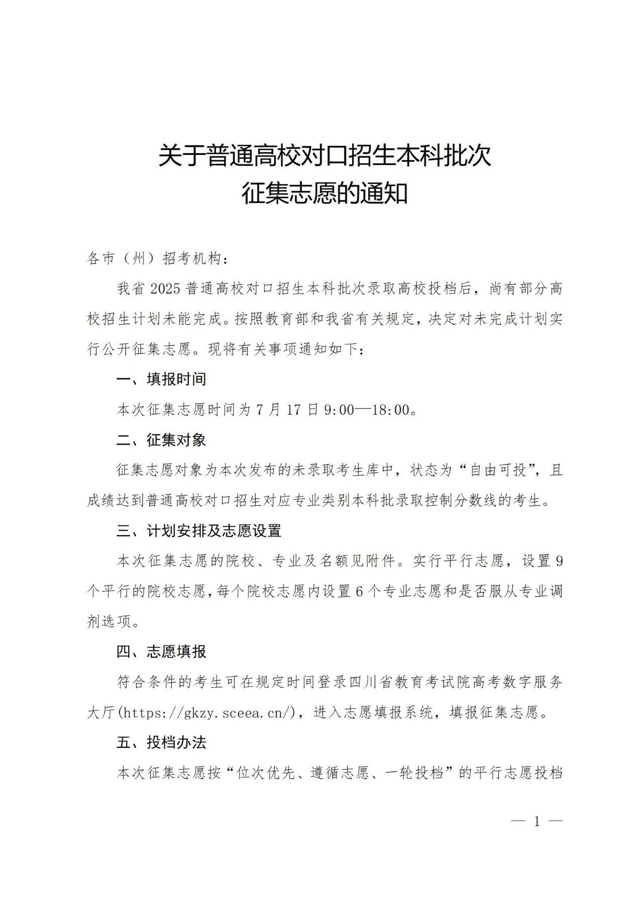 四川关于普通高校对口招生本科批次征集志愿的通知 时间:2025-07-17 四川 高考新闻 四川关于普通高校对口招生本科批次征集志愿的通知已发,具体内容如下: 附件:2025 年普通高校对口招生本科批次征集志愿院校、专业及名额