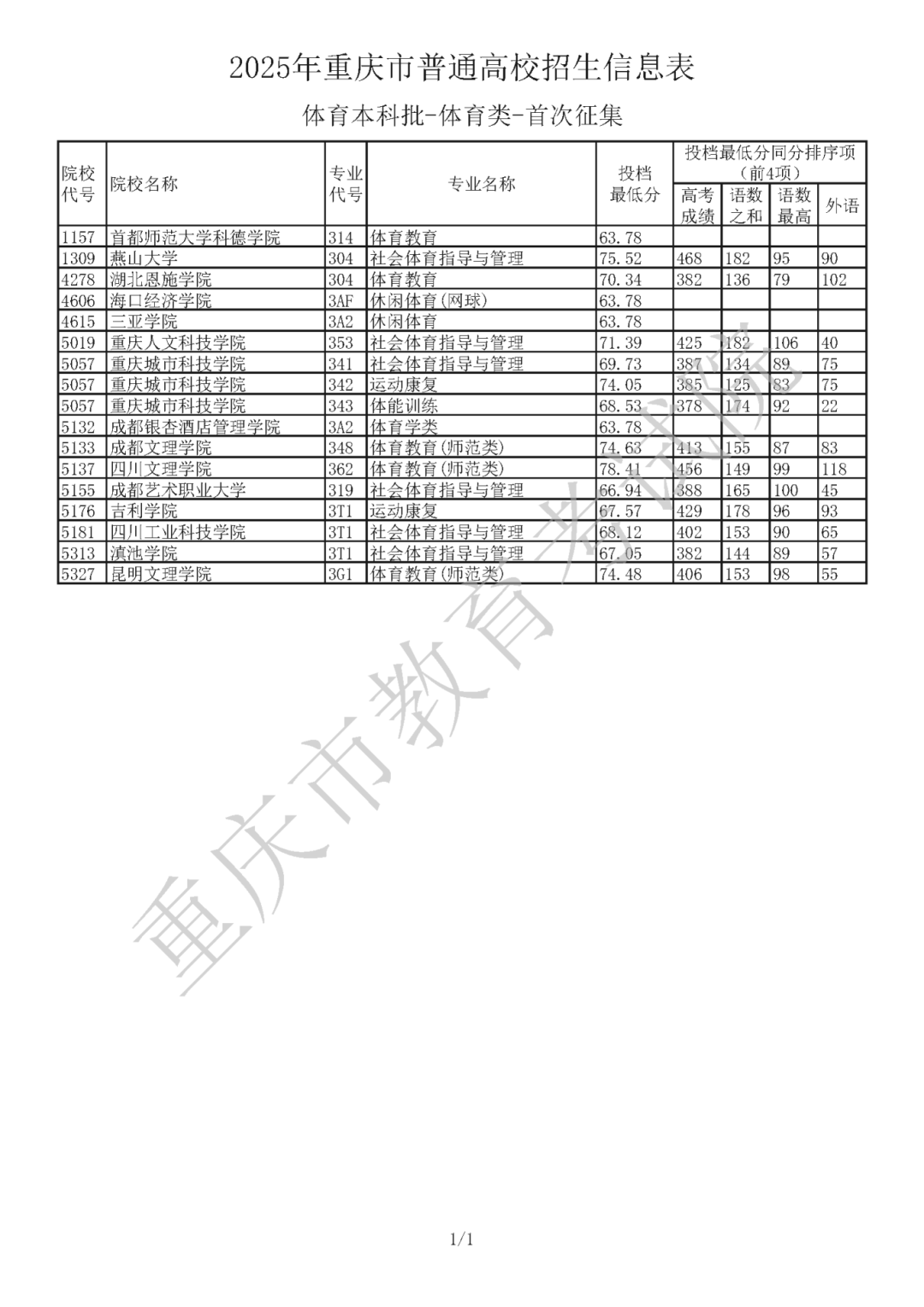 2025年重庆市普通高校招生信息表 体育本科批(首次征集)