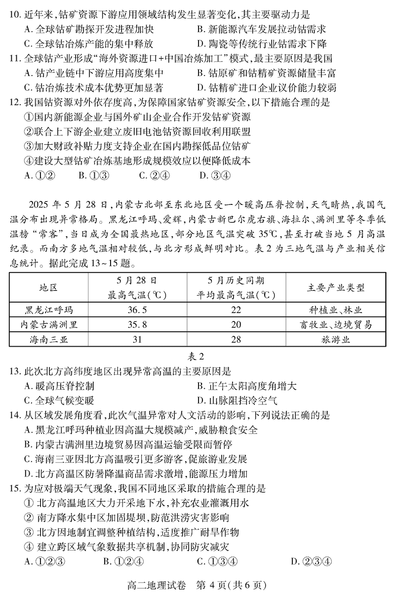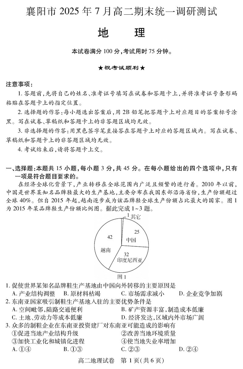 襄阳市2025年7月高二期末统测地理试题及答案 时间:2025-07-18 湖北 文综试题 湖北省襄阳市2025年7月高二期末统测地理考试已于近日开考,为方便考生考后及时查看考试情况,查漏补缺、弥补不足,本文整理了试题答案解析相关信息! 汇总:湖北省襄阳市2025年7月高二期末统测 地理试题及答案解析