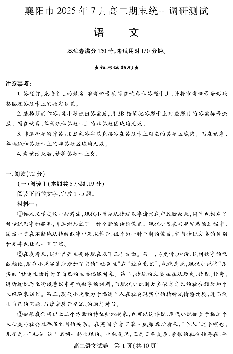 襄阳市2025年7月高二期末统测语文试题及答案 时间:2025-07-18 湖北 语文试题 湖北省襄阳市2025年7月高二期末统测语文考试已于近日开考,为方便考生考后及时查看考试情况,查漏补缺、弥补不足,本文整理了试题答案解析相关信息! 汇总:湖北省襄阳市2025年7月高二期末统测 语文试题及答案解析
