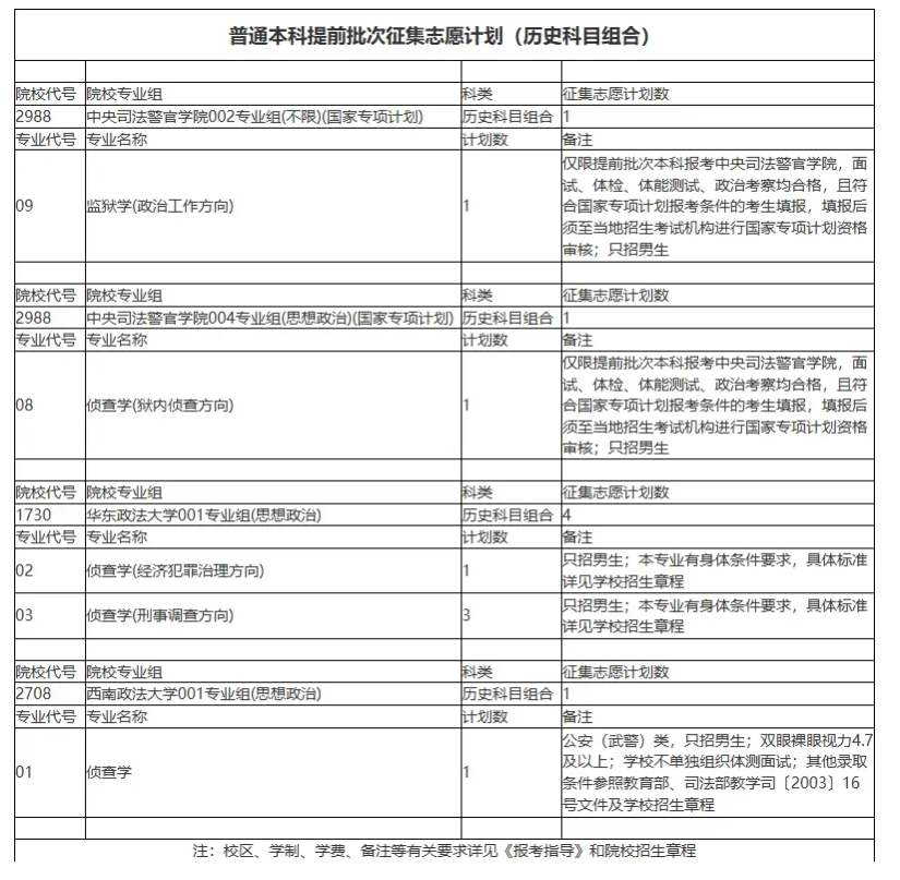 中央司法警官学院:002专业组(国家专项)招收监狱学(政治工作方向)1人,004专业组(国家专项)招收侦查学(狱内侦查方向)1人,均仅限男生,须面试、体检、体能测试、政审合格,并通过国家专项资格审核。