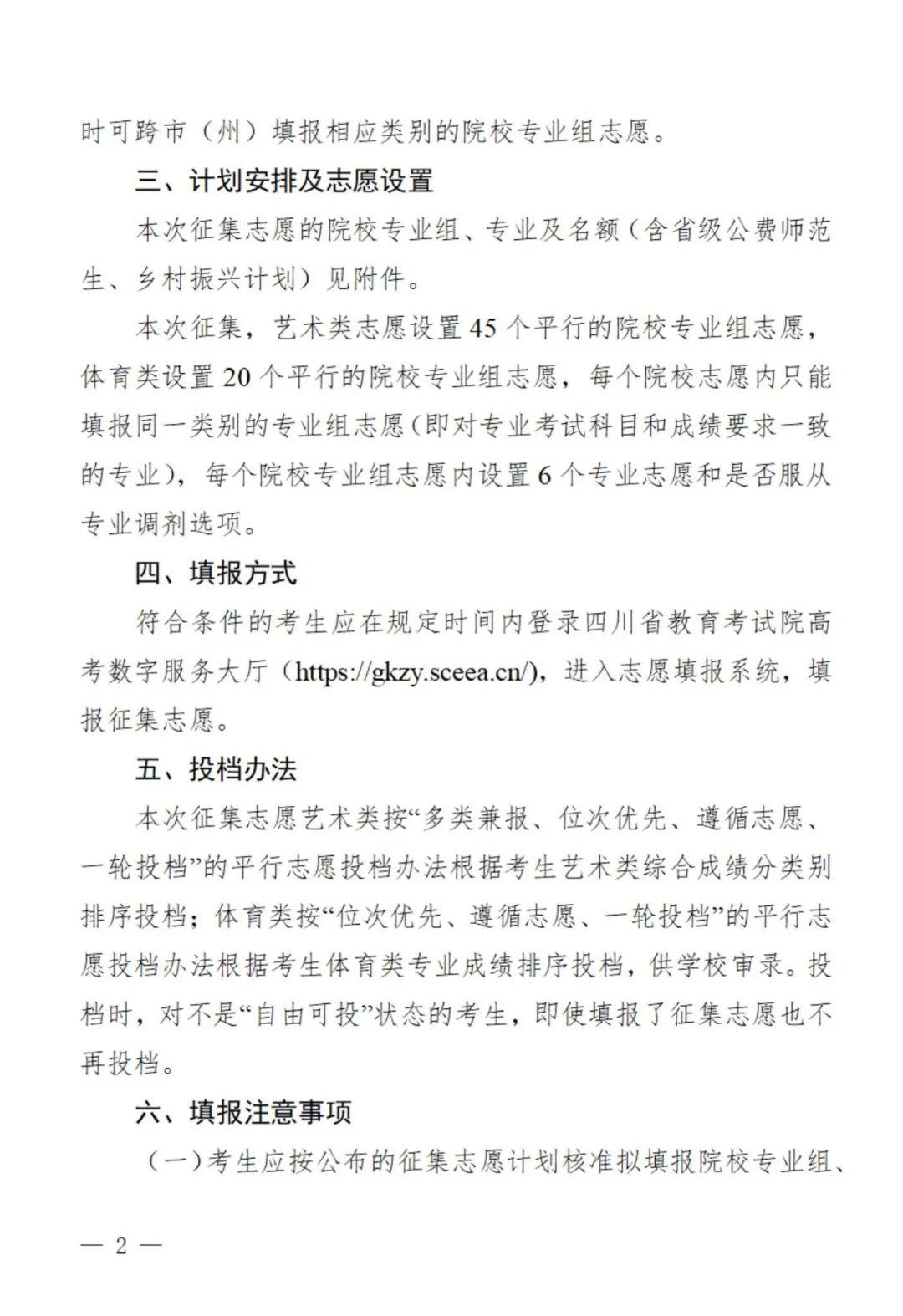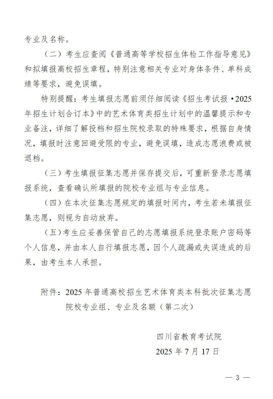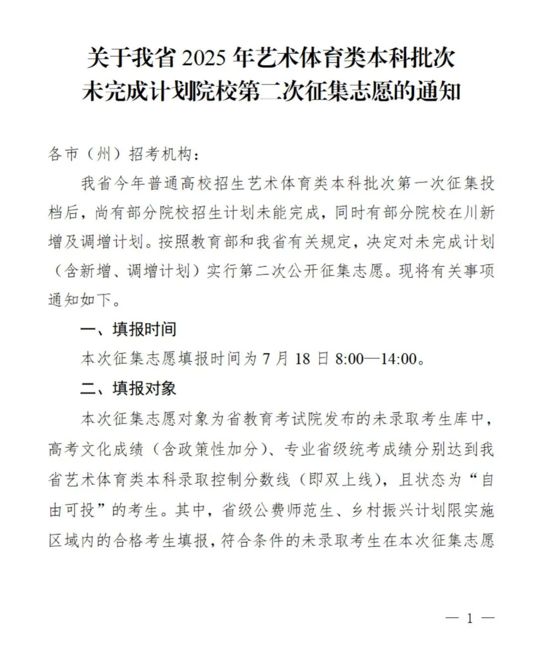 四川省2025年艺术体育类本科批次未完成计划院校第二次征集志愿 时间:2025-07-18 四川 高考新闻 关于四川省2025年艺术体育类本科批次未完成计划院校第二次征集志愿的通知已发布,具体内容如下: 附件:2025年普通高校招生艺术体育类本科批次征集志愿院校专业组、专业及名额(第二次)