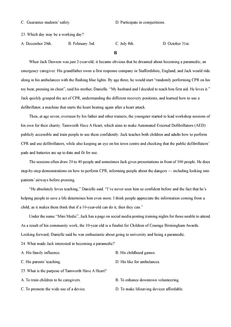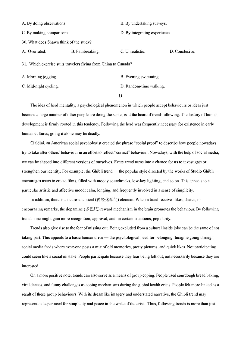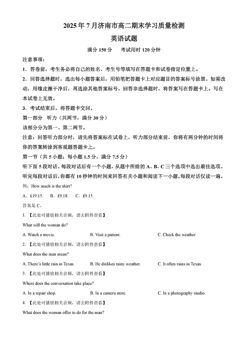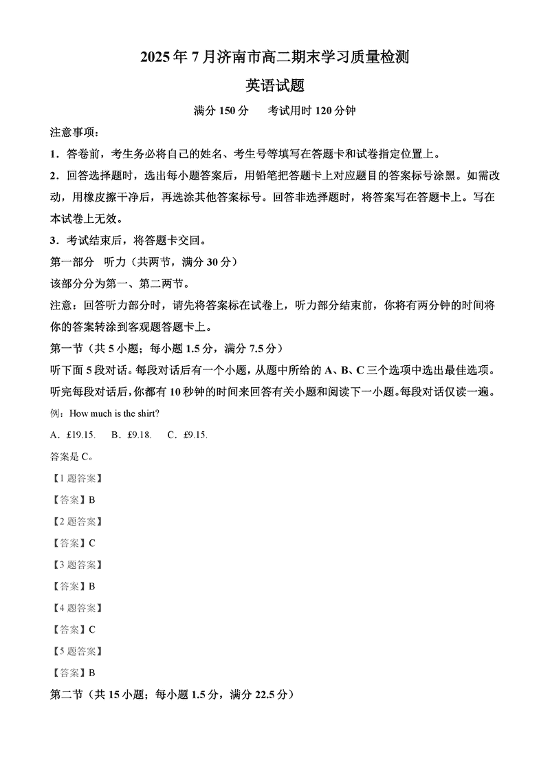 2025年7月济南市高二期末学习质检英语试题及答案 时间:2025-07-18 山东 英语试题 2025年7月济南市高二期末学习质检英语考试已于近日开考,为方便考生考后及时查看考试情况,查漏补缺、弥补不足,本文整理了试题答案解析相关信息! 汇总:2025年7月济南市高二期末学习质检 英语试题及答案解析