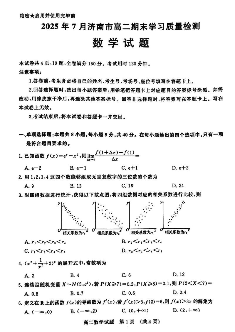 2025年7月济南市高二期末学习质检数学试题及答案 时间:2025-07-18 山东 数学试题 2025年7月济南市高二期末学习质检数学考试已于近日开考,为方便考生考后及时查看考试情况,查漏补缺、弥补不足,本文整理了试题答案解析相关信息! 汇总:2025年7月济南市高二期末学习质检 数学试题及答案解析