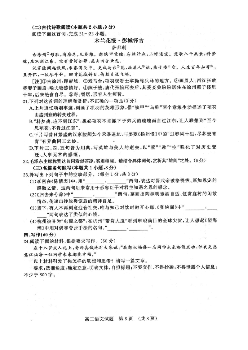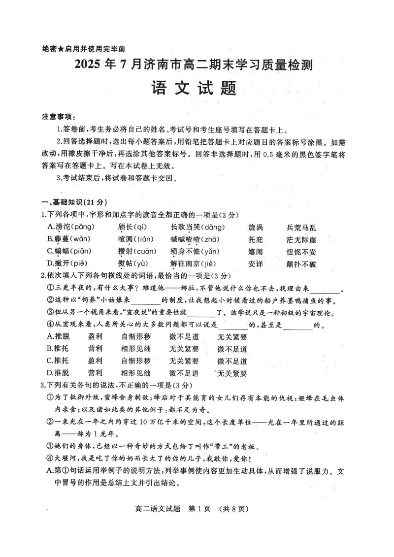 2025年7月济南市高二期末学习质检语文试题及答案 时间:2025-07-18 山东 语文试题 2025年7月济南市高二期末学习质检语文考试已于近日开考,为方便考生考后及时查看考试情况,查漏补缺、弥补不足,本文整理了试题答案解析相关信息! 汇总:2025年7月济南市高二期末学习质检 语文试题及答案解析