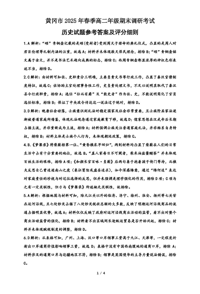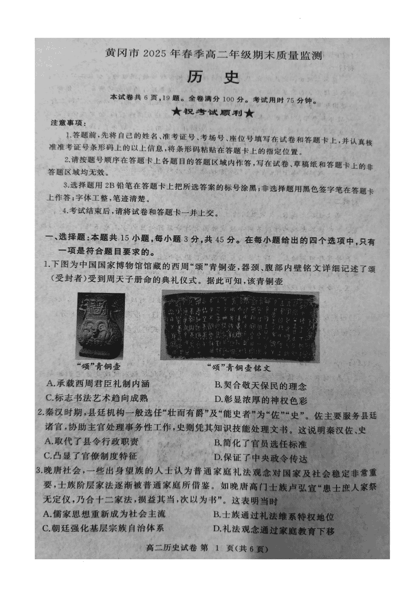 黄冈市2024-2025学年高二期末质量监测历史试题及答案 时间:2025-07-18 湖北 文综试题 湖北省黄冈市2024-2025学年高二期末质量监测历史考试已于近日开考,为方便考生考后及时查看考试情况,查漏补缺、弥补不足,本文整理了试题答案解析相关信息! 汇总:黄冈市2024-2025学年高二期末质量监测 历史试题及答案解析