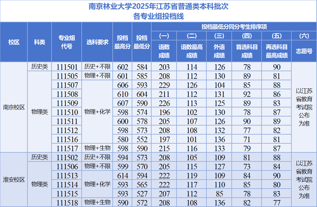 南京林业大学2025年在江苏投档分数线公布