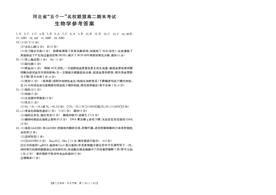 河北“五个一”名校联盟2024-2025学年高二7月期末生物考试已于近日开考,为方便考生考后及时查看考试情况,查漏补缺、弥补不足,本文整理了试题答案解析相关信息!