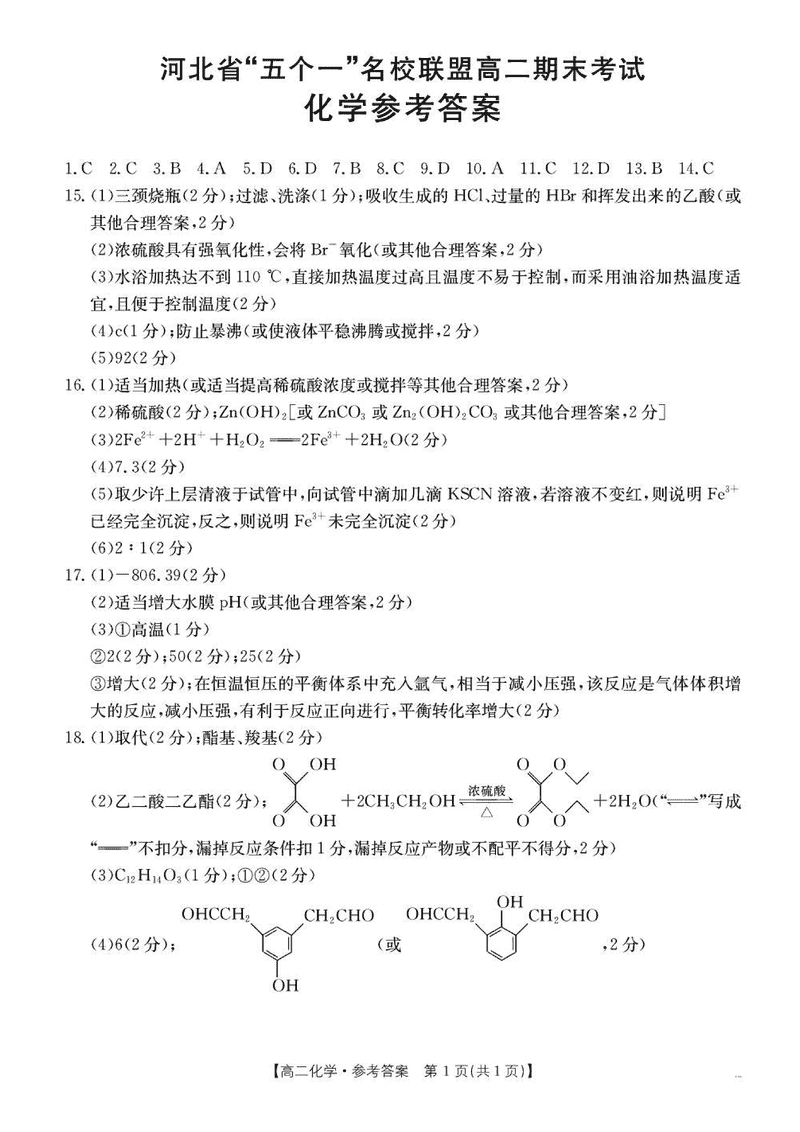 河北“五个一”名校联盟2025年高二7月期末化学试题及答案