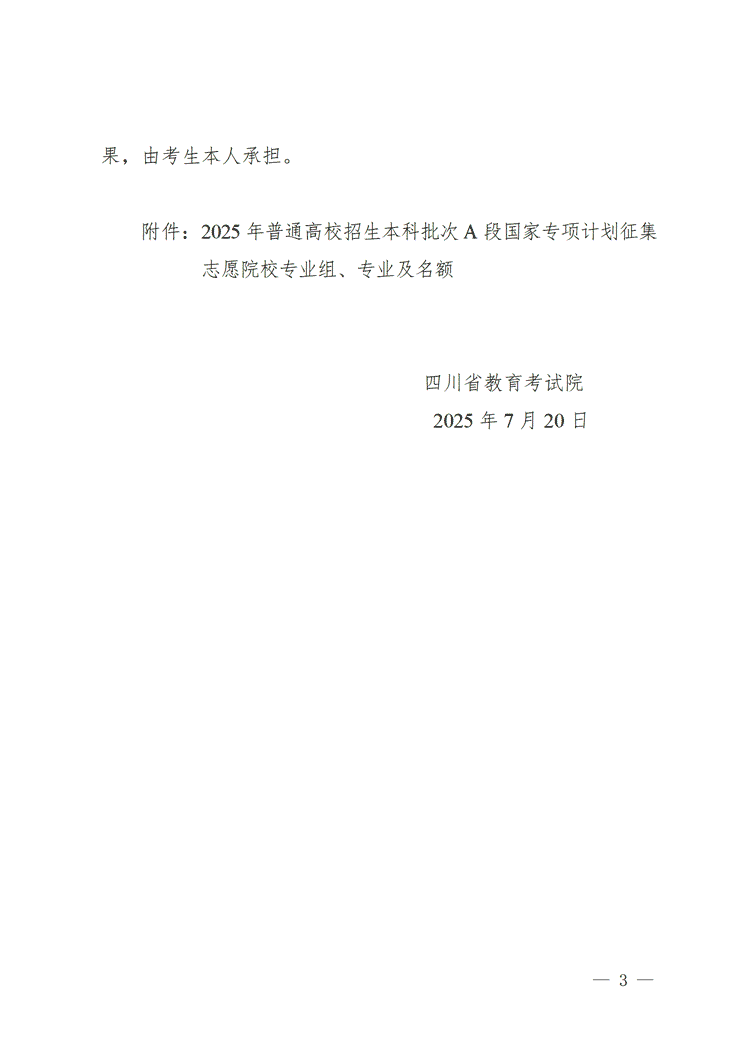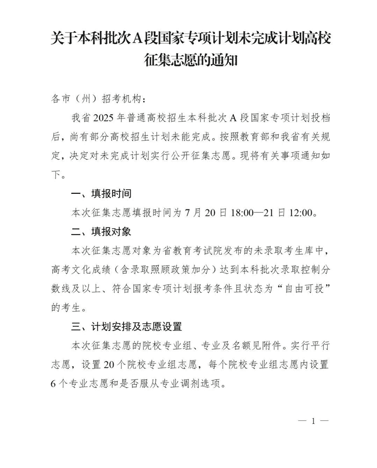 四川关于本科批次A段国家专项计划未完成计划高校征集志愿的通知 时间:2025-07-21 四川 高考新闻 四川关于本科批次A段国家专项计划未完成计划高校征集志愿的通知已发布,具体内容如下: 附件:2025年普通高校招生本科批次A段国家专项计划征集志愿院校专业组、专业及名额